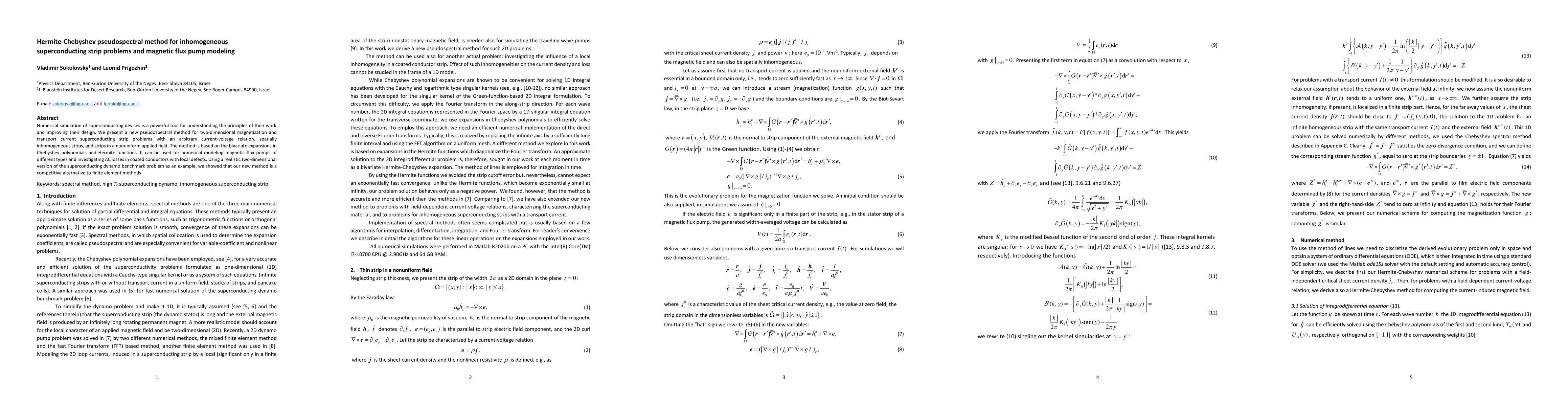 This paper introduces a novel Hermite-Chebyshev pseudospectral method for simulating inhomogeneous superconducting strip problems, including magnetic flux pumps and AC losses in coated conductors. The method, based on bivariate expansions in Chebyshev polynomials and Hermite functions, demonstrates competitive accuracy compared to finite element methods.