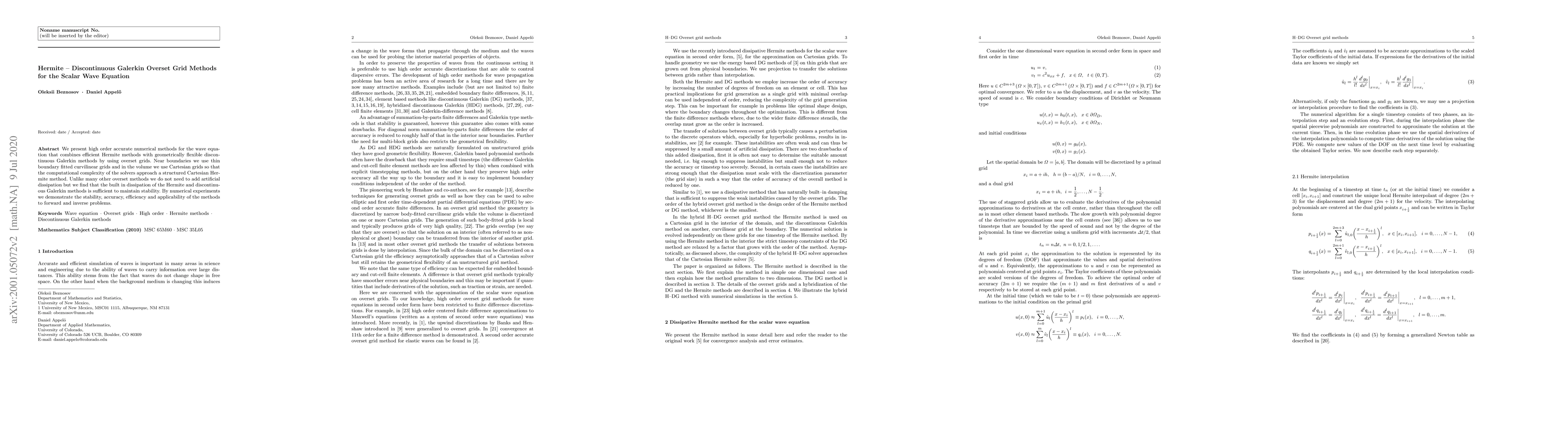 This paper introduces high-order numerical methods combining Hermite and discontinuous Galerkin techniques over overset grids for solving the scalar wave equation. The method leverages boundary-fitted curvilinear grids near boundaries and Cartesian grids in the volume, achieving computational efficiency while maintaining stability without artificial dissipation.