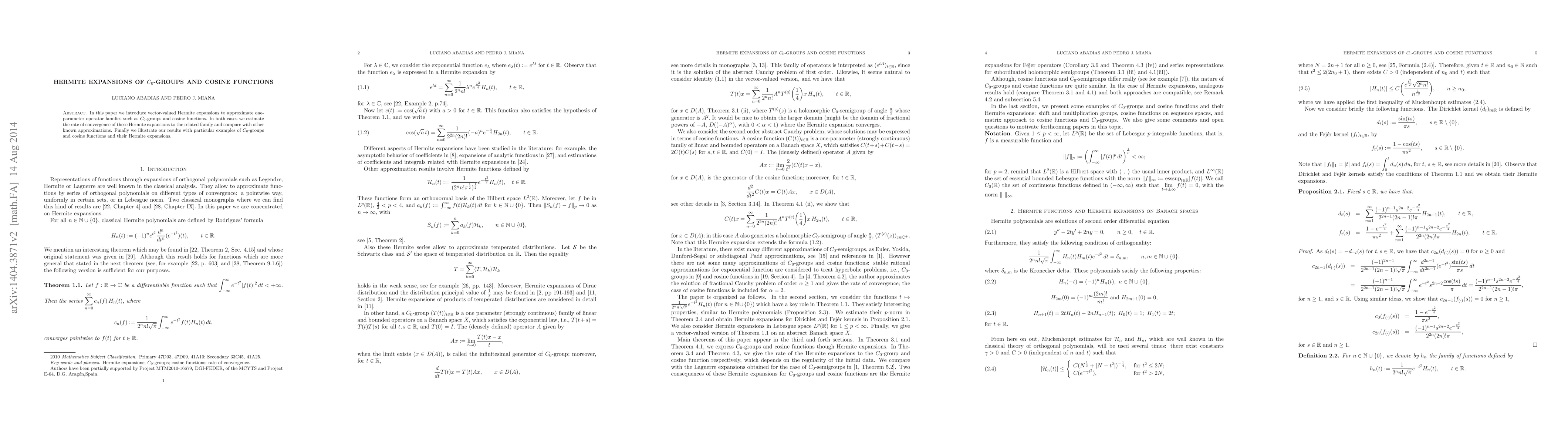 This paper introduces vector-valued Hermite expansions to approximate $C_0$-groups and cosine functions, estimating their convergence rates and comparing them with existing approximations. Specific examples of these expansions are provided to illustrate the results.