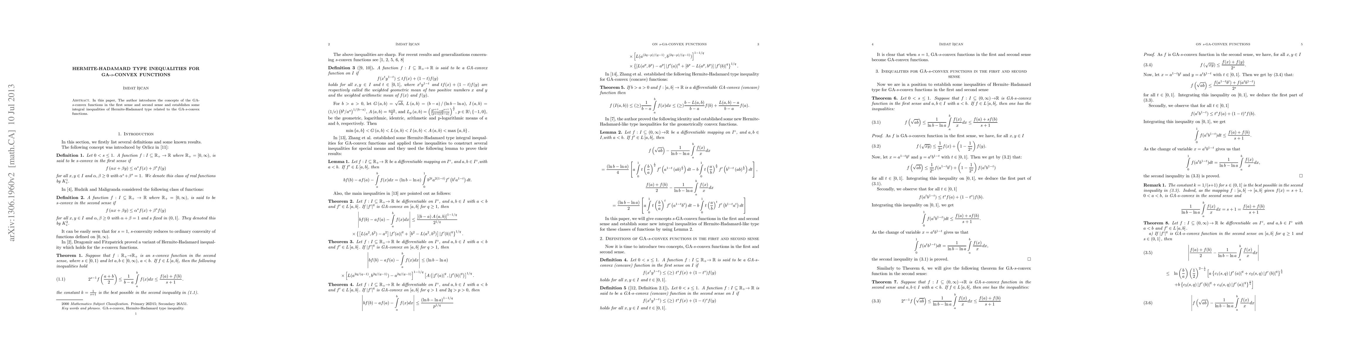 This paper introduces GA-s-convex functions in two senses and establishes Hermite-Hadamard type integral inequalities for these functions, expanding the understanding of convexity in mathematical analysis.
