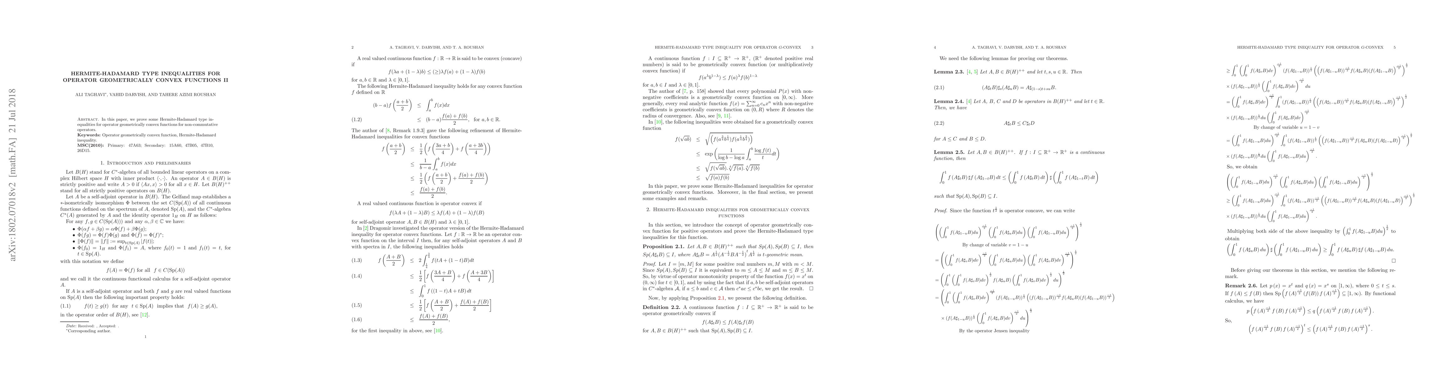 Summary: This paper establishes Hermite-Hadamard type inequalities for operator geometrically convex functions, extending the results to non-commutative operators. It focuses on the mathematical properties and inequalities related to these functions. Keywords include "Operator geometrically convex function" and "Hermite-Hadamard inequality."