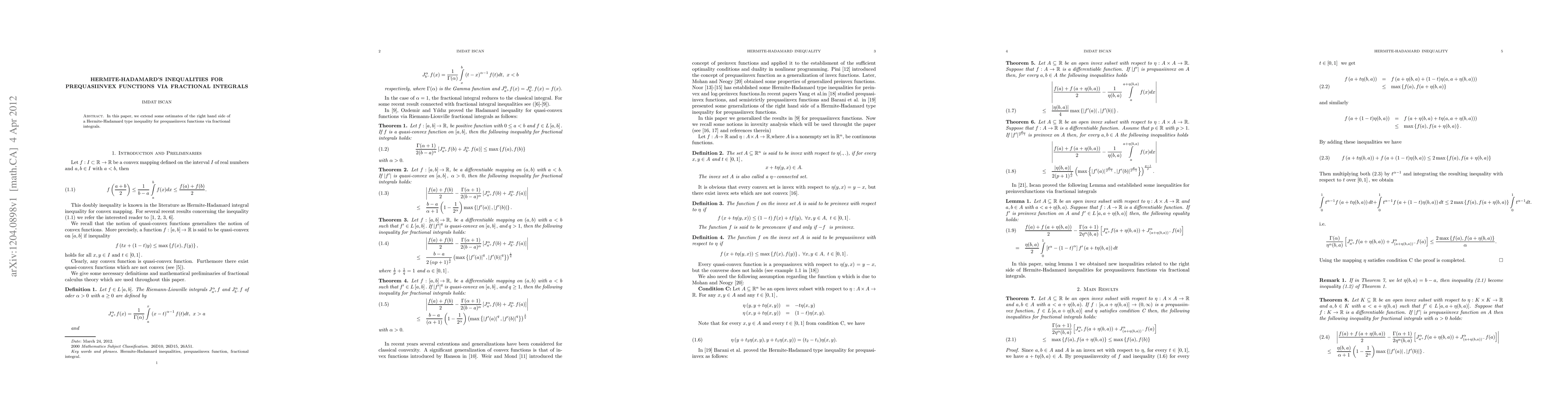 Summary: This paper extends Hermite-Hadamard's inequalities for prequasiinvex functions using fractional integrals to provide refined estimates on the right-hand side of the inequality. The study focuses on the application of fractional integrals in optimizing these mathematical bounds.