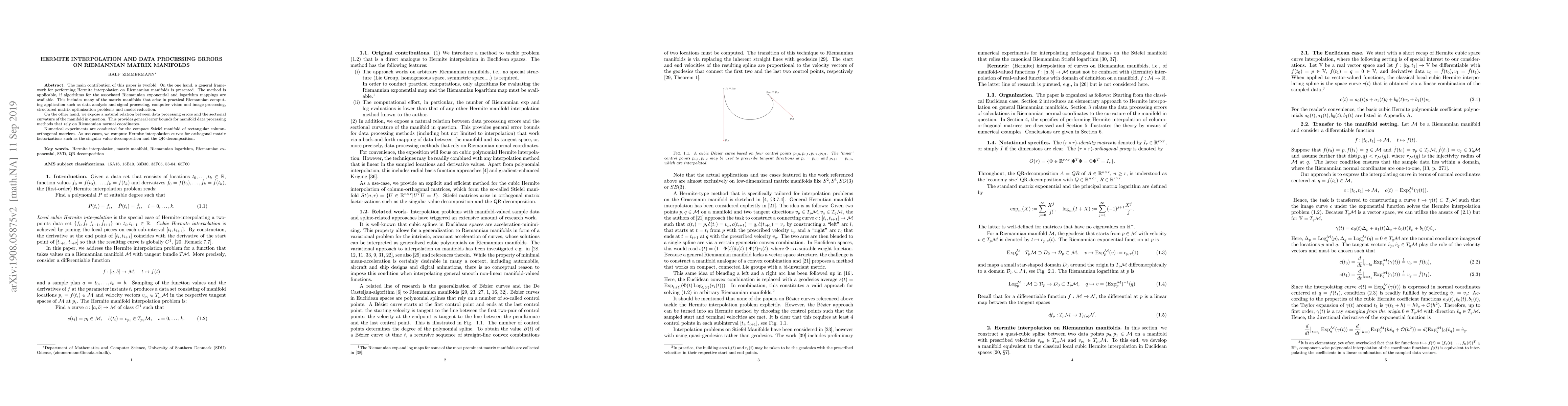 The main contribution of this paper is twofold: On the one hand, a general framework for performing Hermite interpolation on Riemannian manifolds is presented. The method is applicable, if algorithms for the associated Riemannian exponential and logarithm mappings are available. This includes many of the matrix manifolds that arise in practical Riemannian computing application such as data analysis and signal processing, computer vision and image processing, structured matrix optimization problems and model reduction. On the other hand, we expose a natural relation between data processing errors and the sectional curvature of the manifold in question. This provides general error bounds for manifold data processing methods that rely on Riemannian normal coordinates. Numerical experiments are conducted for the compact Stiefel manifold of rectangular column-orthogonal matrices. As use cases, we compute Hermite interpolation curves for orthogonal matrix factorizations such as the singular value decomposition and the QR-decomposition.