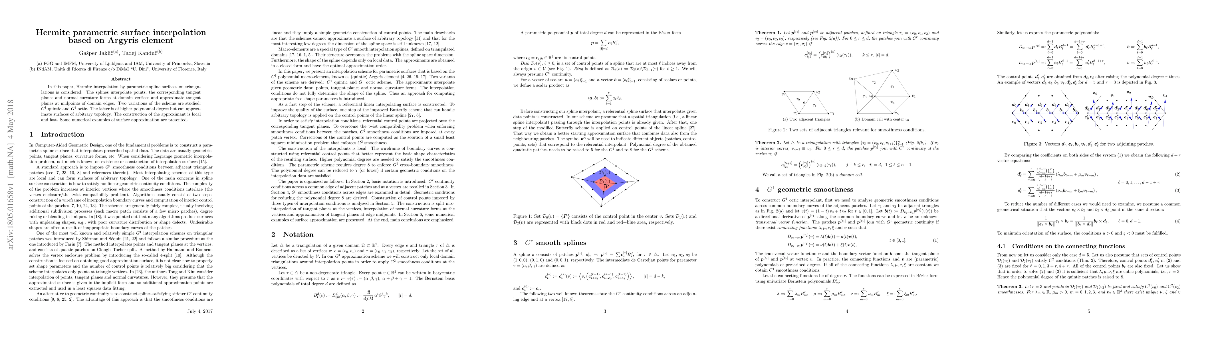 This paper explores Hermite parametric surface interpolation using Argyris elements, focusing on C1 quintic and G1 octic splines that interpolate points, tangent planes, and normal curvatures. The method allows for fast, local construction and approximates surfaces of any topology.