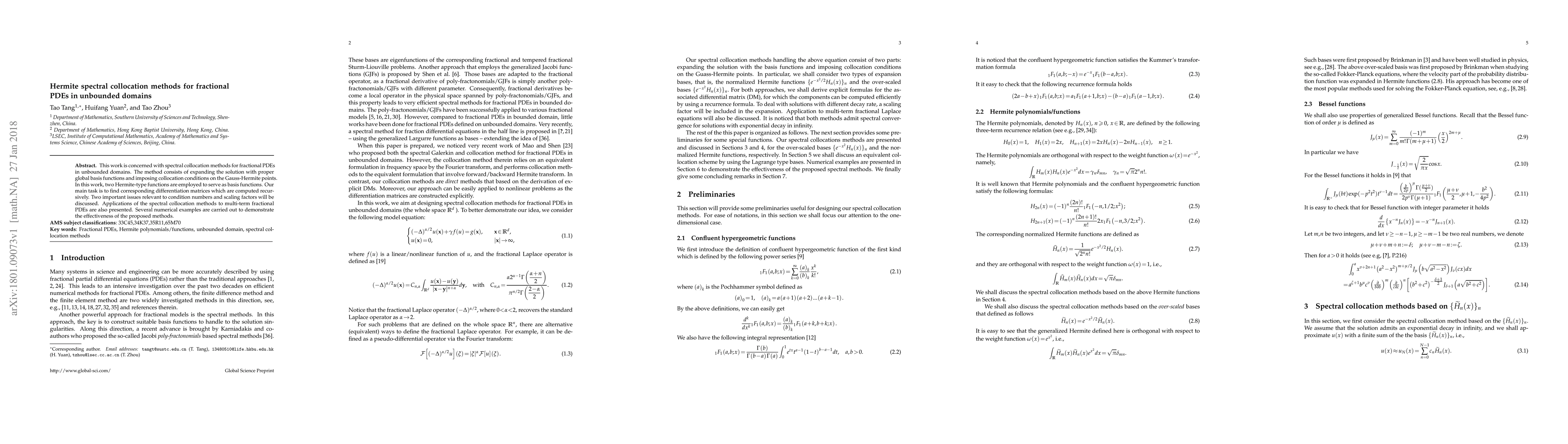 This paper develops Hermite spectral collocation methods for solving fractional partial differential equations (PDEs) in unbounded domains using global basis functions and Gauss-Hermite points. The study focuses on constructing differentiation matrices and discusses condition numbers and scaling factors, with applications to multi-term fractional PDEs validated through numerical examples.