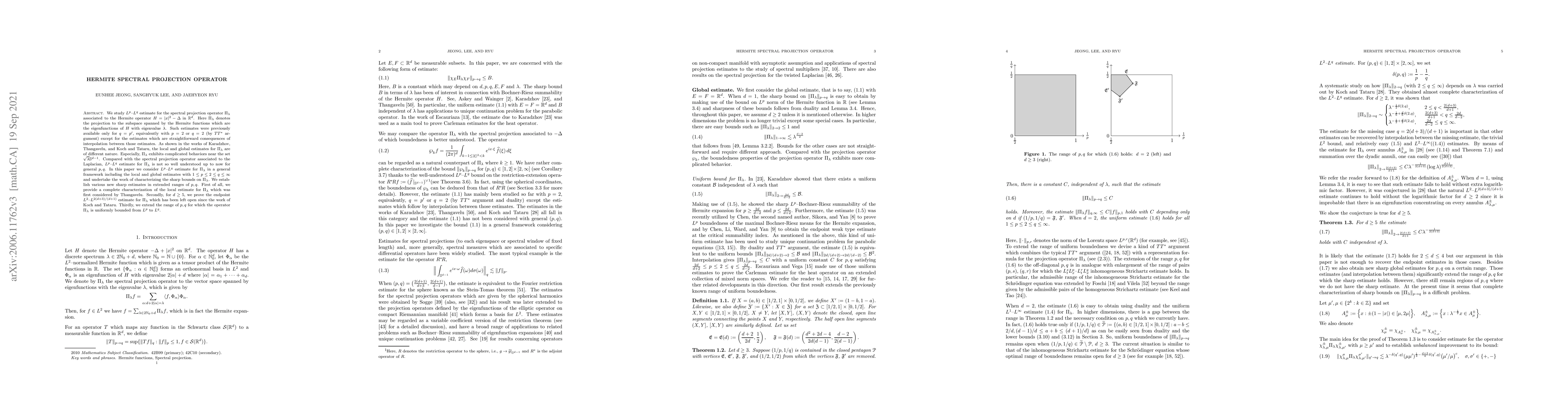 We study $L^p$-$L^q$ estimate for the spectral projection operator $\Pi_\lambda$ associated to the Hermite operator $H=|x|^2-\Delta$ in $\mathbb R^d$. Here $\Pi_\lambda$ denotes the projection to the subspace spanned by the Hermite functions which are the eigenfunctions of $H$ with eigenvalue $\lambda$. Such estimates were previously available only for $q=p'$, equivalently with $p=2$ or $q=2$ (by $TT^*$ argument) except for the estimates which are straightforward consequences of interpolation between those estimates. As shown in the works of Karadzhov, Thangavelu, and Koch and Tataru, the local and global estimates for $\Pi_\lambda$ are of different nature. Especially, $\Pi_\lambda$ exhibits complicated behaviors near the set $\sqrt\lambda\mathbb S^{d-1}$. Compared with the spectral projection operator associated to the Laplacian, $L^p$-$L^q$ estimate for $\Pi_\lambda$ is not so well understood up to now for general $p,q$. In this paper we consider $L^p$--$L^q$ estimate for $\Pi_\lambda$ in a general framework including the local and global estimates with $1\le p\le 2\le q\le \infty$ and undertake the work of characterizing the sharp bounds on $\Pi_\lambda$. We establish various new sharp estimates in extended ranges of $p,q$. First of all, we provide a complete characterization of the local estimate for $\Pi_\lambda$ which was first considered by Thangavelu. Secondly, for $d\ge5$, we prove the endpoint $L^2$--$L^{2(d+3)/(d+1)}$ estimate for $\Pi_\lambda$ which has been left open since the work of Koch and Tataru. Thirdly, we extend the range of $p,q$ for which the operator $\Pi_\lambda$ is uniformly bounded from $L^p$ to $L^q$.