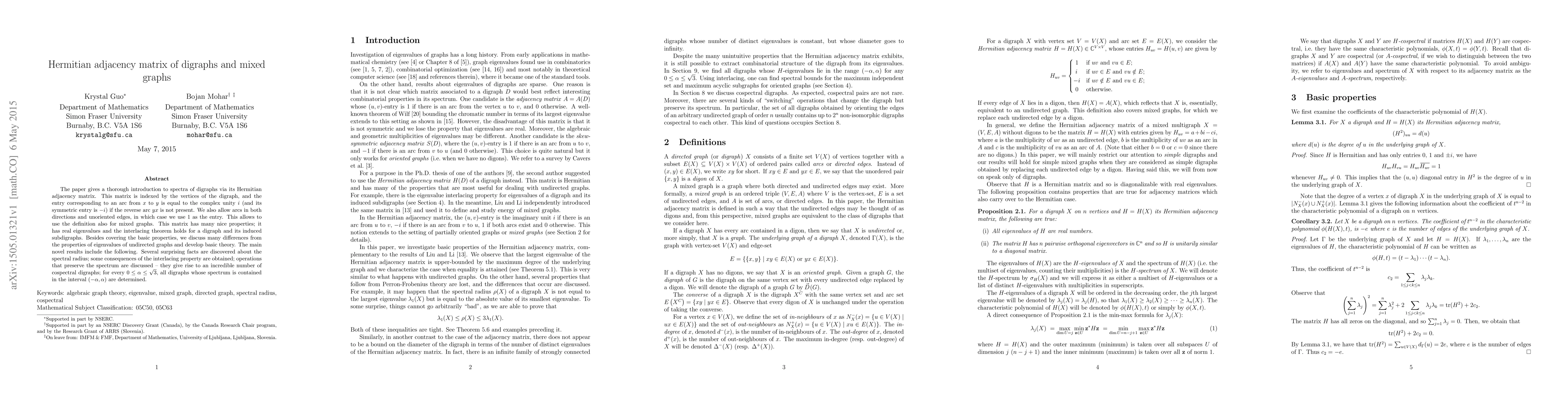 This paper explores the spectra of directed graphs (digraphs) and mixed graphs using a Hermitian adjacency matrix, revealing real eigenvalues and the interlacing theorem. It identifies unique spectral properties and determines all digraphs with spectra within specific intervals.