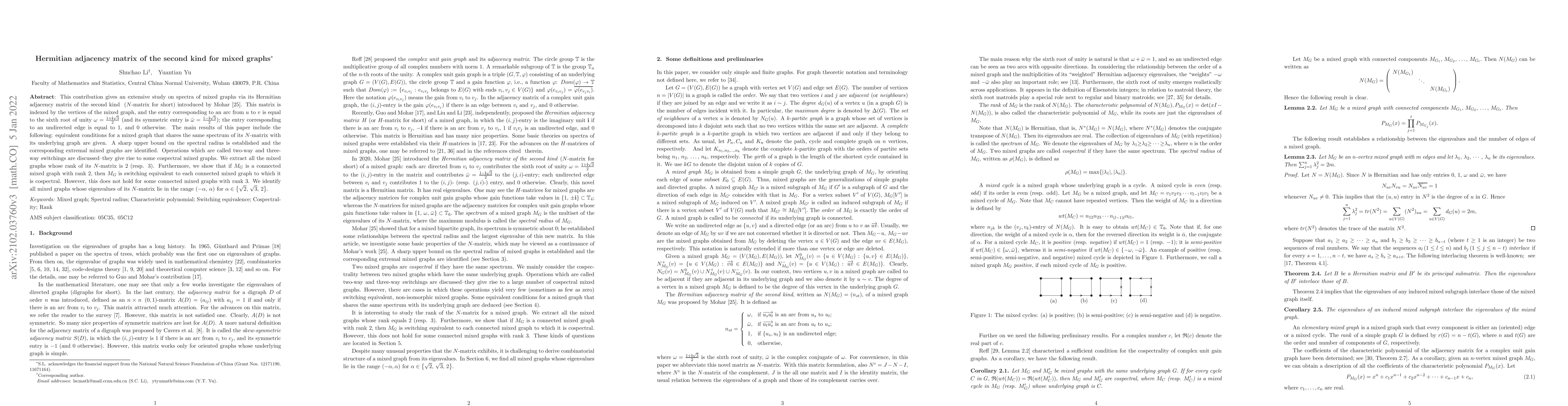 This contribution gives an extensive study on spectra of mixed graphs via its Hermitian adjacency matrix of the second kind { ($N$-matrix for short)} introduced by Mohar \cite{0001}. This matrix is indexed by the vertices of the mixed graph, and the entry corresponding to an arc from $u$ to $v$ is equal to the sixth root of unity $\omega=\frac{1+{\bf i}\sqrt{3}}{2}$ (and its symmetric entry is $\bar{\omega}=\frac{1-{\bf i}\sqrt{3}}{2}$); the entry corresponding to an undirected edge is equal to 1, and 0 otherwise. The main results of this paper include the following: {equivalent} conditions for a mixed graph that shares the same spectrum of its $N$-matrix with its underlying graph are given. A sharp upper bound on the spectral radius is established and the corresponding extremal mixed graphs are identified. Operations which are called two-way and three-way switchings are discussed--they give rise to some cospectral mixed graphs. We extract all the mixed graphs whose rank of its $N$-matrix is $2$ (resp. 3). Furthermore, we show that {if $M_G$ is a connected mixed graph with rank $2,$ then $M_G$ is switching equivalent to each connected mixed graph to which it is cospectral}. However, this does not hold for some connected mixed graphs with rank $3$. We identify all mixed graphs whose eigenvalues of its $N$-matrix lie in the range $(-\alpha,\, \alpha)$ for $\alpha\in\left\{\sqrt{2},\,\sqrt{3},\,2\right\}$.