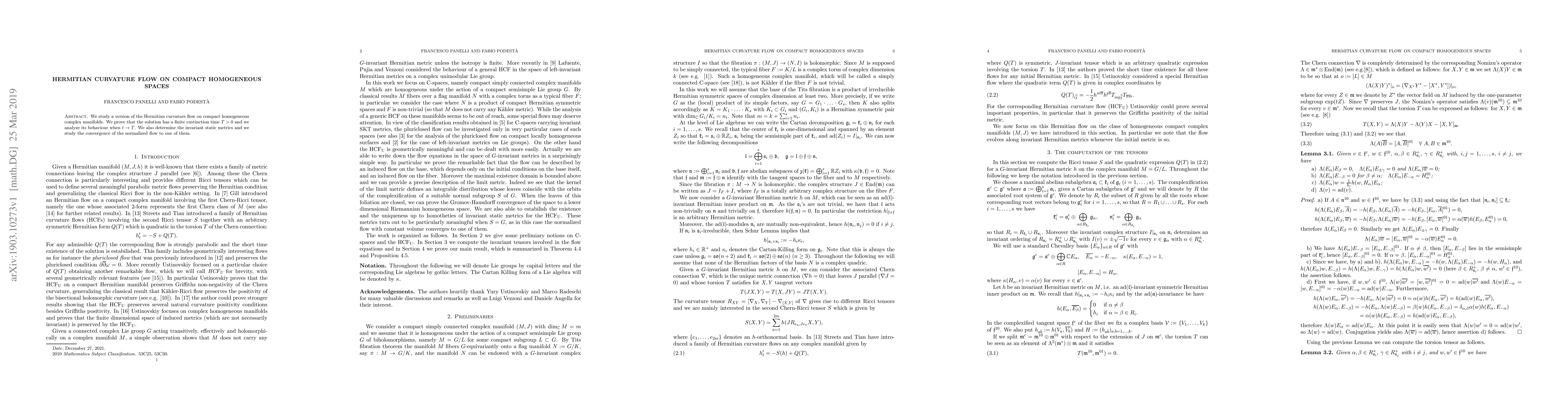 This paper investigates a Hermitian curvature flow on compact homogeneous complex manifolds, proving that the flow has a finite extinction time and analyzing its behavior as time approaches this limit. It also identifies invariant static metrics and examines the convergence of the normalized flow to one of these metrics.