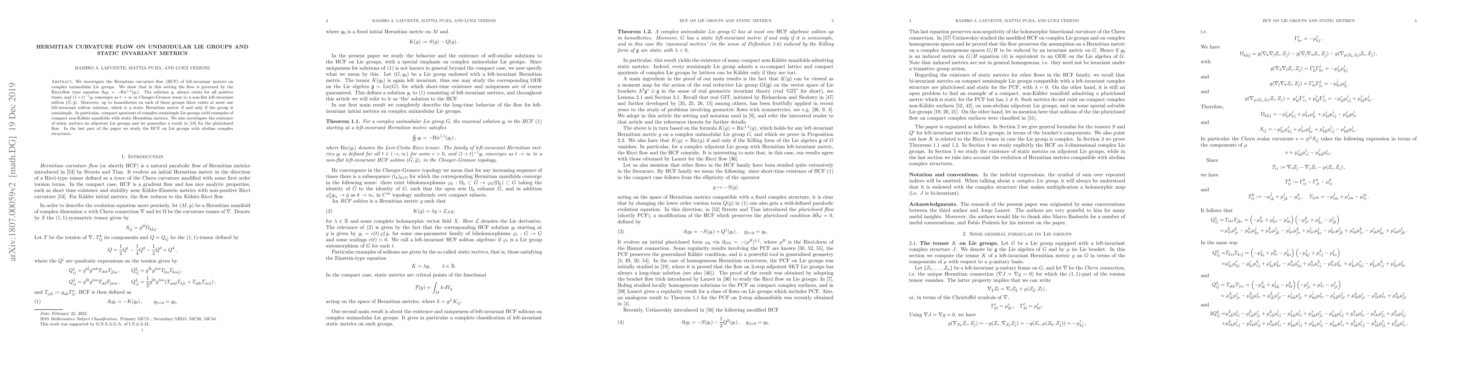 This paper studies the Hermitian curvature flow on complex unimodular Lie groups, proving that it evolves according to a Ricci-flow type equation and always converges to a non-flat soliton. It finds that static Hermitian metrics exist only on semisimple groups, providing compact quotients of such groups as examples of non-Kähler manifolds with static metrics.
