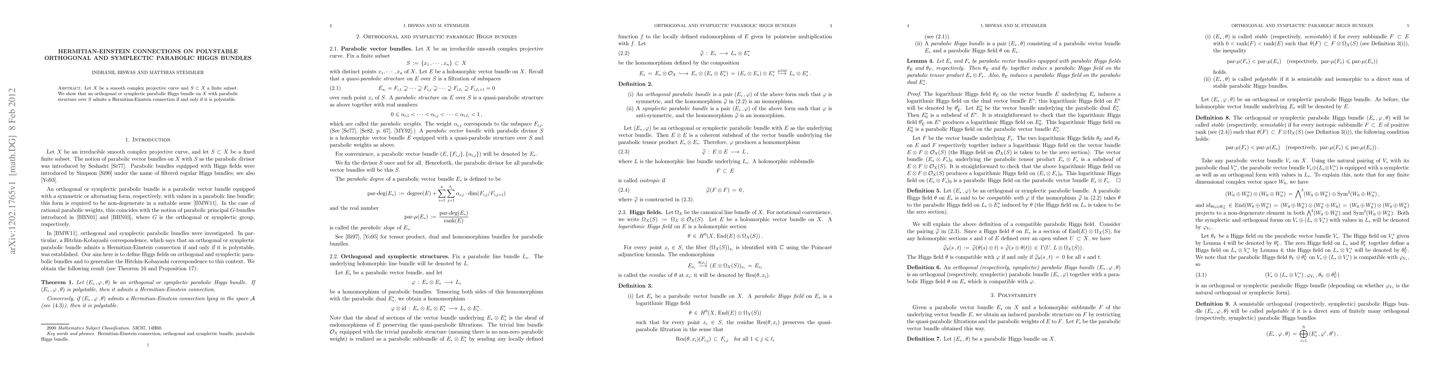 Let X be a smooth complex projective curve and S a finite subset of X. We show that an orthogonal or symplectic parabolic Higgs bundle on X with parabolic structure over S admits a Hermitian-Einstein connection if and only if it is polystable.