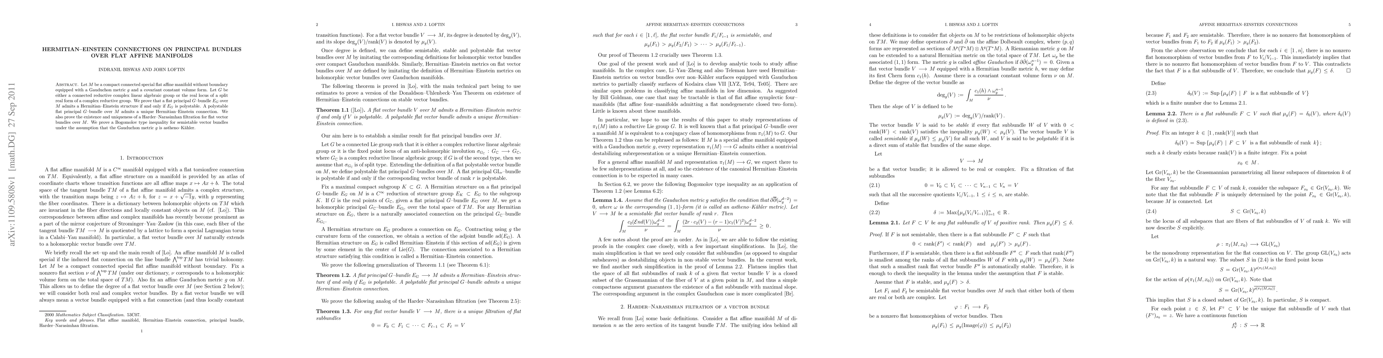 This paper proves the existence and uniqueness of Hermitian-Einstein structures on flat principal $G$-bundles over compact special flat affine manifolds under specific conditions. It also establishes the polystability condition for such bundles and demonstrates the existence of a unique Hermitian-Einstein connection for polystable bundles.