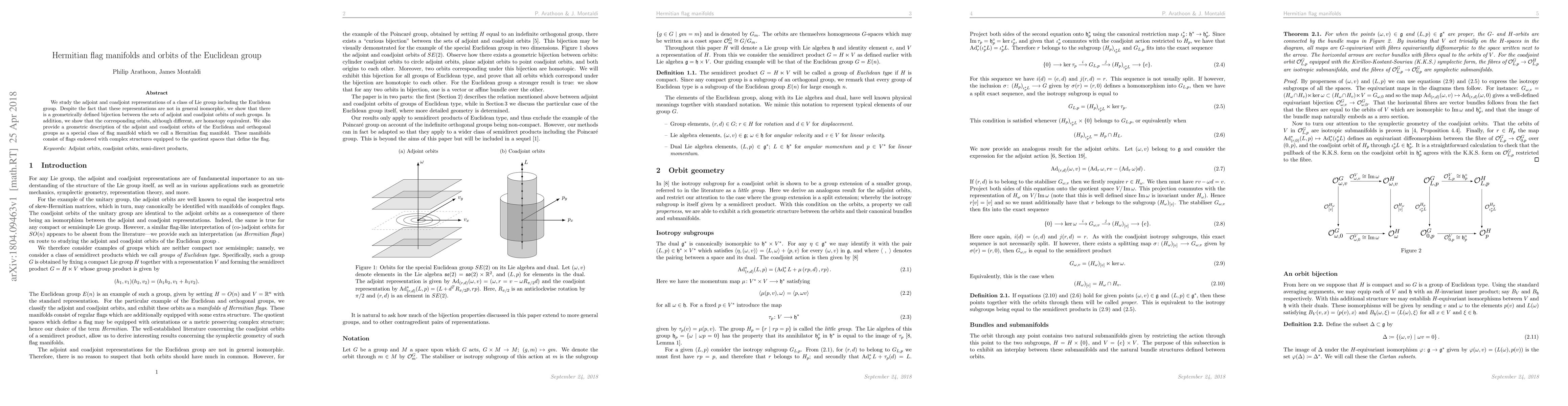This paper explores the adjoint and coadjoint representations of the Euclidean group, revealing a geometric bijection between their respective orbits despite non-isomorphism. It also demonstrates homotopy equivalence between these orbits and describes them as a special type of flag manifold known as a Hermitian flag manifold.