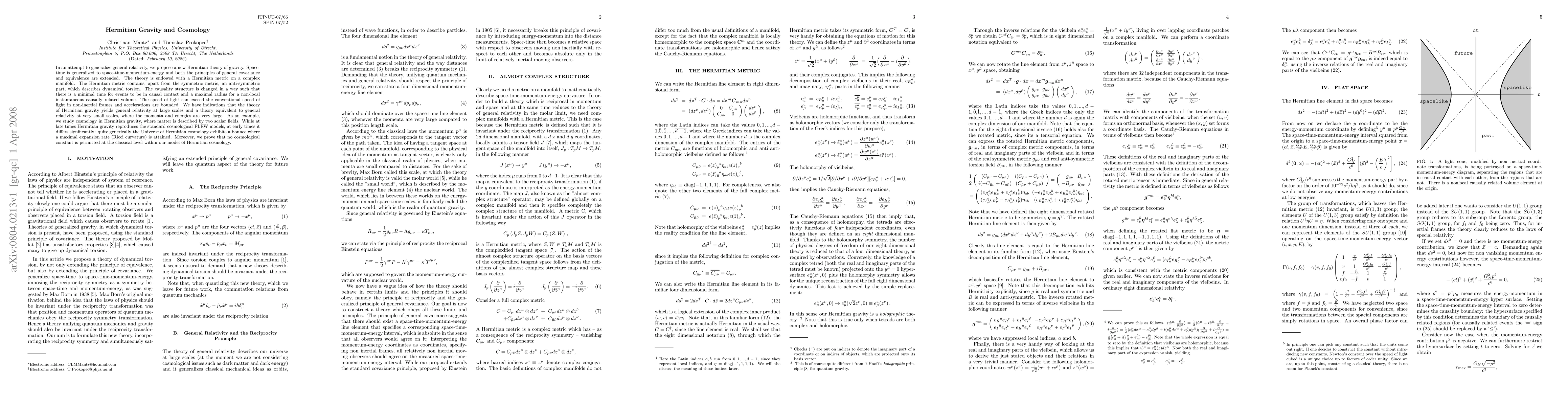 In an attempt to generalize general relativity, we propose a new Hermitian theory of gravity. Space-time is generalized to space-time-momentum-energy and both the principles of general covariance and equivalence are extended. The theory is endowed with a Hermitian metric on a complex manifold. The Hermitian metric contains, apart from the symmetric metric, an anti-symmetric part, which describes dynamical torsion. The causality structure is changed in a way such that there is a minimal time for events to be in causal contact and a maximal radius for a non-local instantaneous causally related volume. The speed of light can exceed the conventional speed of light in non-inertial frames and accelerations are bounded. We have indications that the theory of Hermitian gravity yields general relativity at large scales and a theory equivalent to general relativity at very small scales, where the momenta and energies are very large. As an example, we study cosmology in Hermitian gravity, where matter is described by two scalar fields. While at late times Hermitian gravity reproduces the standard cosmological FLRW models, at early times it differs significantly: quite generically the Universe of Hermitian cosmology exhibits a bounce where a maximal expansion rate (Ricci curvature) is attained. Moreover, we prove that no cosmological constant is permitted at the classical level within our model of Hermitian cosmology.