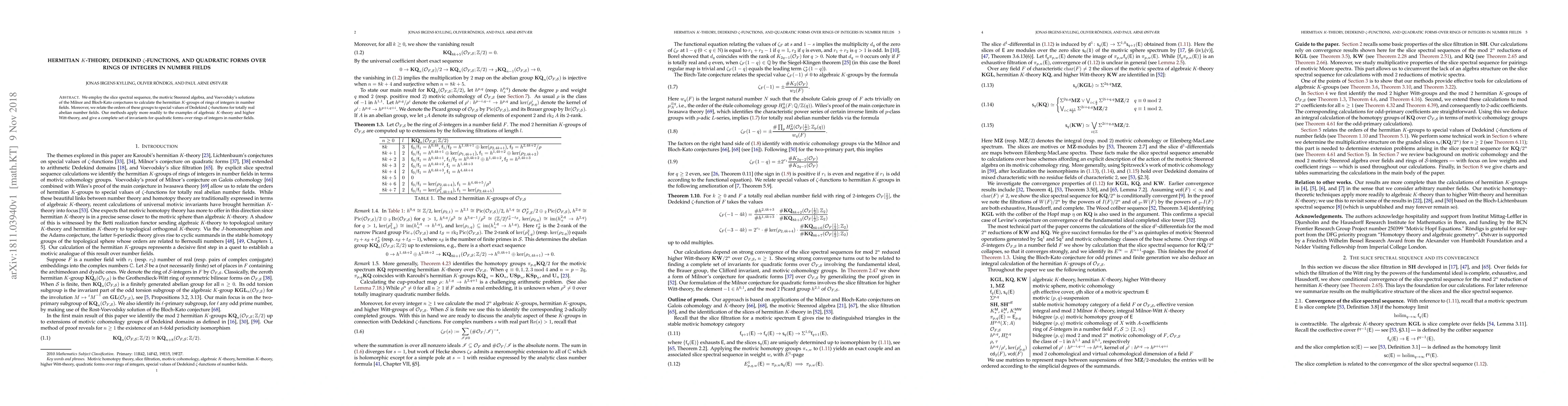 We employ the slice spectral sequence, the motivic Steenrod algebra, and Voevodsky's solutions of the Milnor and Bloch-Kato conjectures to calculate the hermitian $K$-groups of rings of integers in number fields. Moreover, we relate the orders of these groups to special values of Dedekind $\zeta$-functions for totally real abelian number fields. Our methods apply more readily to the examples of algebraic $K$-theory and higher Witt-theory, and give a complete set of invariants for quadratic forms over rings of integers in number fields.