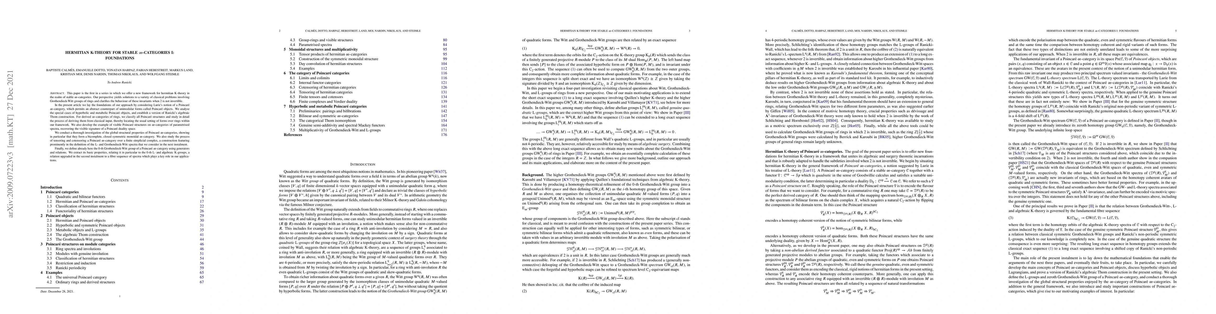 This paper lays the foundational framework for Hermitian K-theory in stable $\infty$-categories, introducing Poincaré $\infty$-categories and classifying their structures. It studies Poincaré objects, develops the algebraic Thom construction, and defines the 0-th Grothendieck-Witt group, relating it to L- and K-groups.