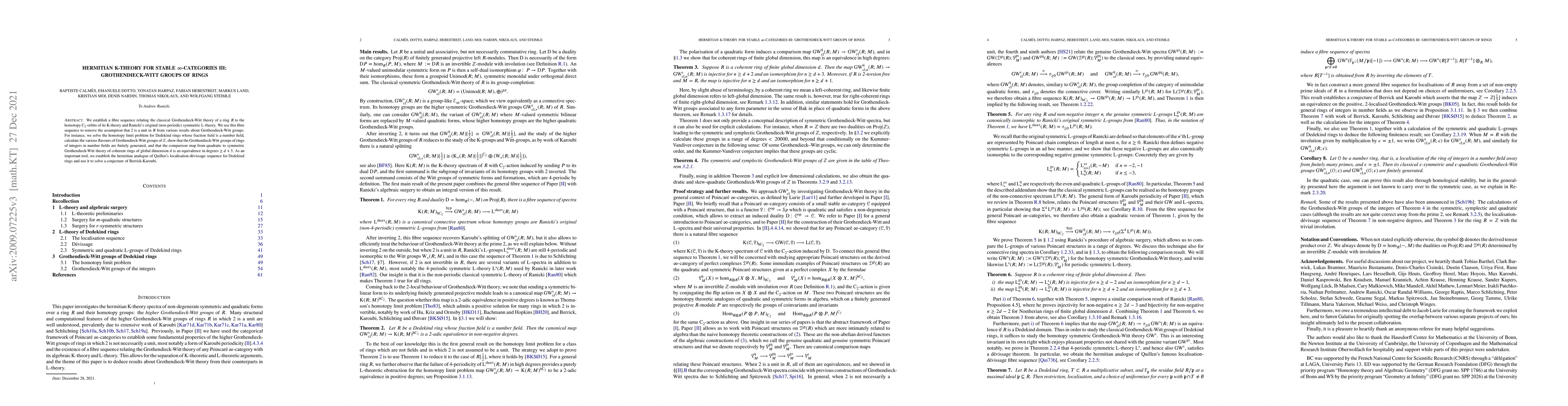 This work advances understanding of Grothendieck-Witt groups and their relation to K-theory and symmetric L-theory, with implications for algebraic number theory and stable ∞-categories.