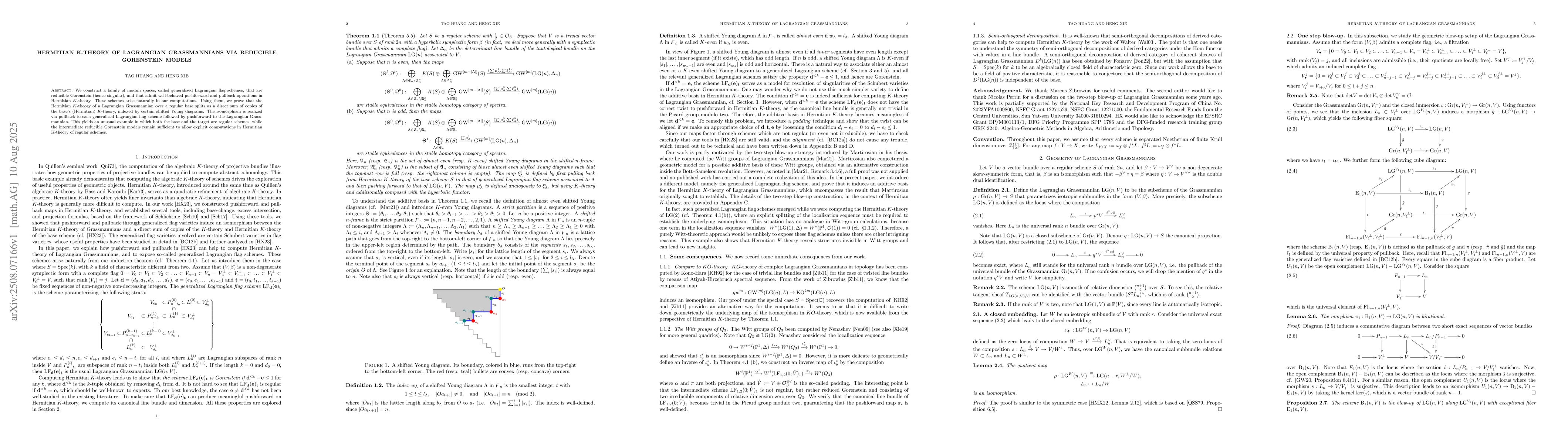 We construct a family of moduli spaces, called generalized Lagrangian flag schemes, that are reducible Gorenstein (hence singular), and that admit well-behaved pushforward and pullback operations in Hermitian $K$-theory. These schemes arise naturally in our computations. Using them, we prove that the Hermitian $K$-theory of a Lagrangian Grassmannian over a regular base splits as a direct sum of copies of the base's (Hermitian) $K$-theory, indexed by certain shifted Young diagrams. The isomorphism is realized via pullback to each generalized Lagrangian flag scheme followed by pushforward to the Lagrangian Grassmannian. This yields an unusual example in which both the base and the target are regular schemes, while the intermediate reducible Gorenstein models remain sufficient to allow explicit computations in Hermitian K-theory of regular schemes.