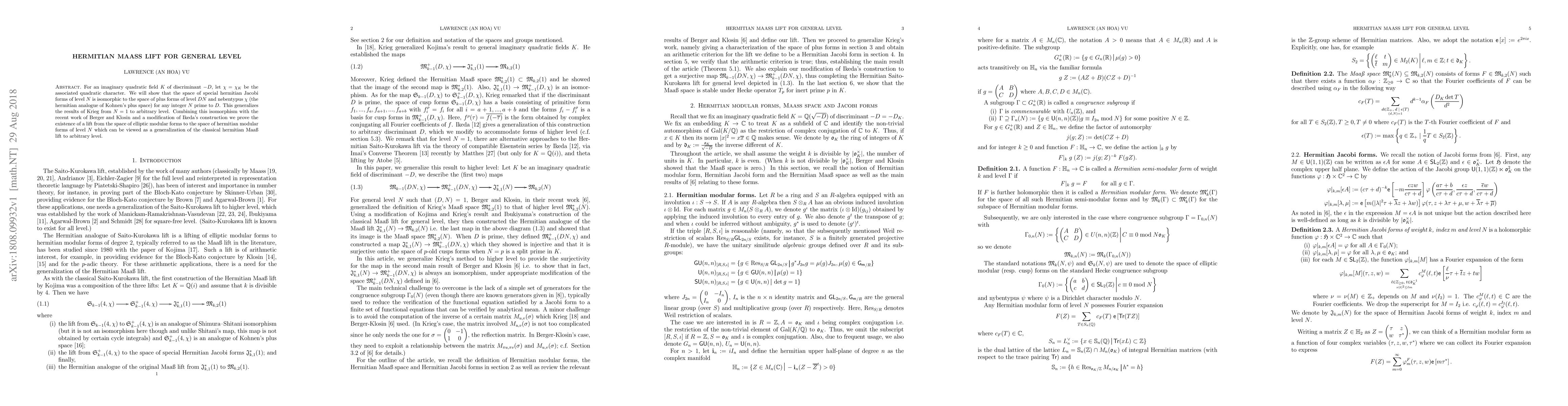 The paper introduces a generalized hermitian Maass lift and proves an isomorphism between spaces of hermitian Jacobi forms and plus forms, extending previous work by Krieg to arbitrary level N.