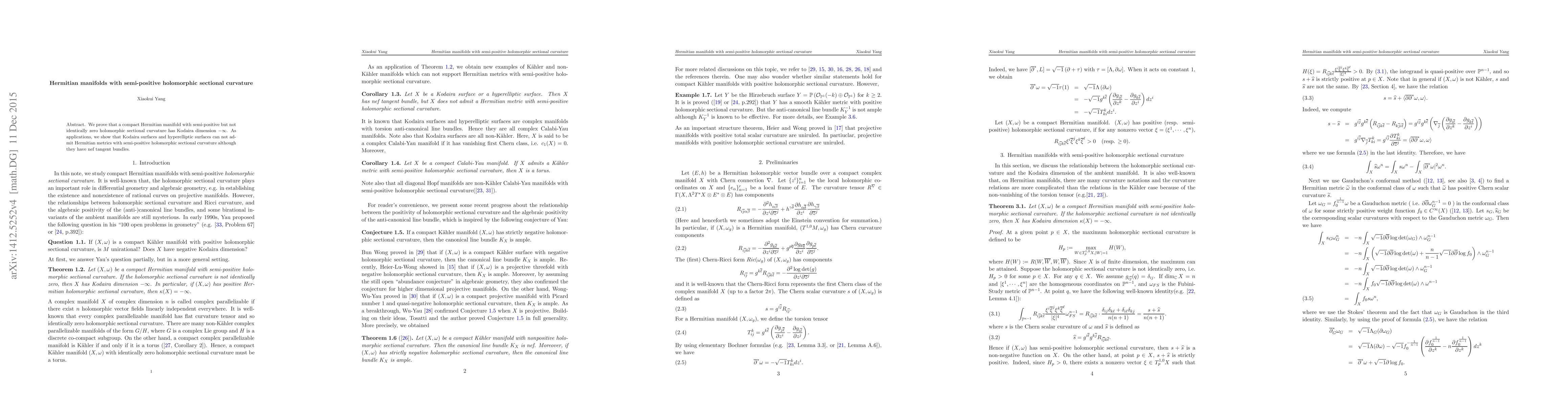 This paper proves that compact Hermitian manifolds with semi-positive, non-zero holomorphic sectional curvature have Kodaira dimension $-\infty$. It also demonstrates that Kodaira and hyperelliptic surfaces cannot support such Hermitian metrics despite having nef tangent bundles.