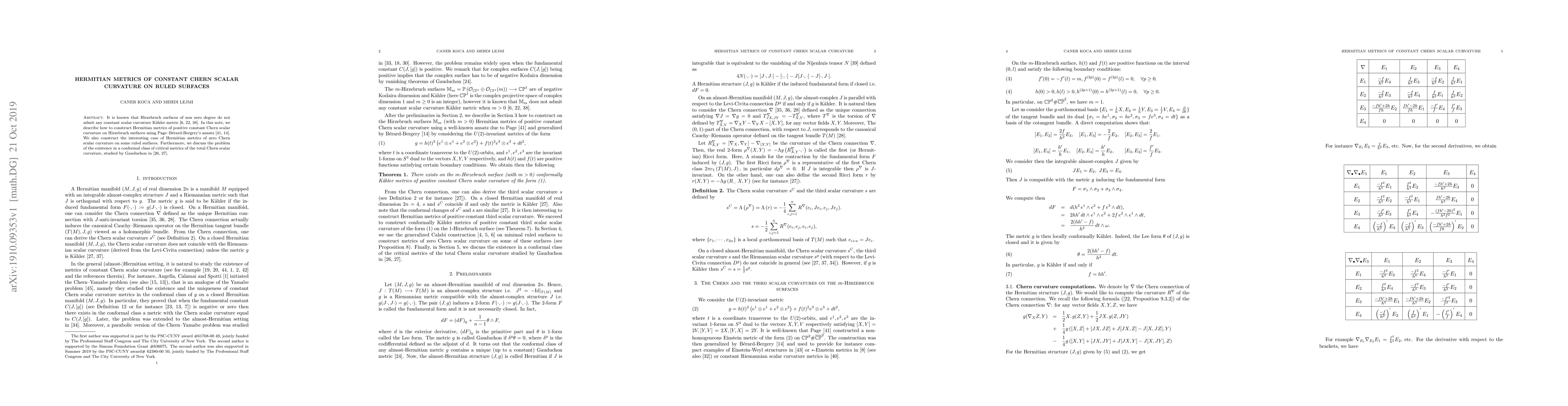 This paper constructs Hermitian metrics of positive constant Chern scalar curvature on Hirzebruch surfaces using a specific ansatz, and explores the case of zero Chern scalar curvature on some ruled surfaces. It also investigates the existence of critical metrics in a conformal class, as studied by Gauduchon.