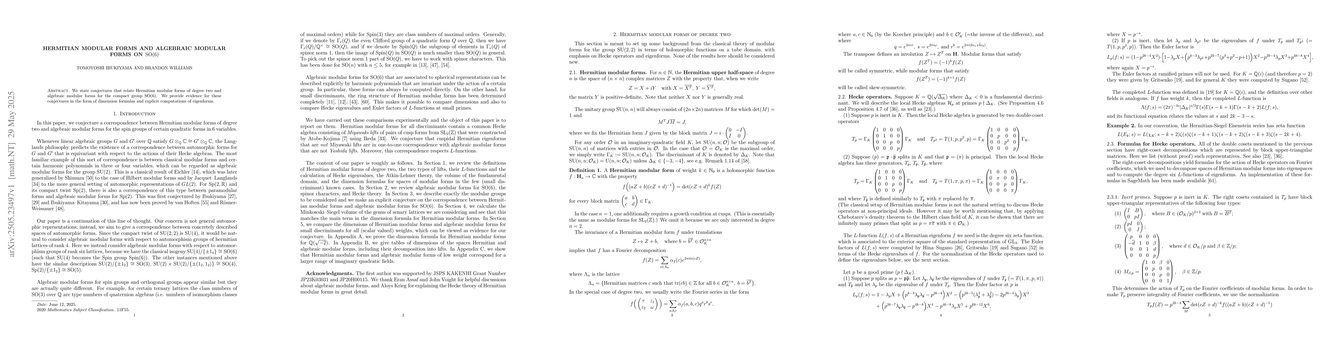 The paper presents conjectures relating Hermitian modular forms of degree two to algebraic modular forms for the compact group SO(6), supported by dimension formulas and explicit computations of eigenforms.