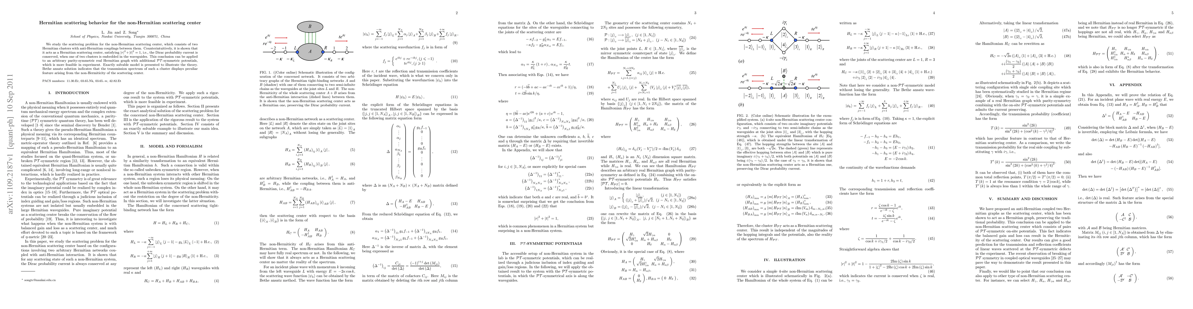 We study the scattering problem for the non-Hermitian scattering center, which consists of two Hermitian clusters with anti-Hermitian couplings between them. Counterintuitively, it is shown that it acts as a Hermitian scattering center, satisfying $|r| ^{2}+|t| ^{2}=1$, i.e., the Dirac probability current is conserved, when one of two clusters is embedded in the waveguides. This conclusion can be applied to an arbitrary parity-symmetric real Hermitian graph with additional PT-symmetric potentials, which is more feasible in experiment. Exactly solvable model is presented to illustrate the theory. Bethe ansatz solution indicates that the transmission spectrum of such a cluster displays peculiar feature arising from the non-Hermiticity of the scattering center.