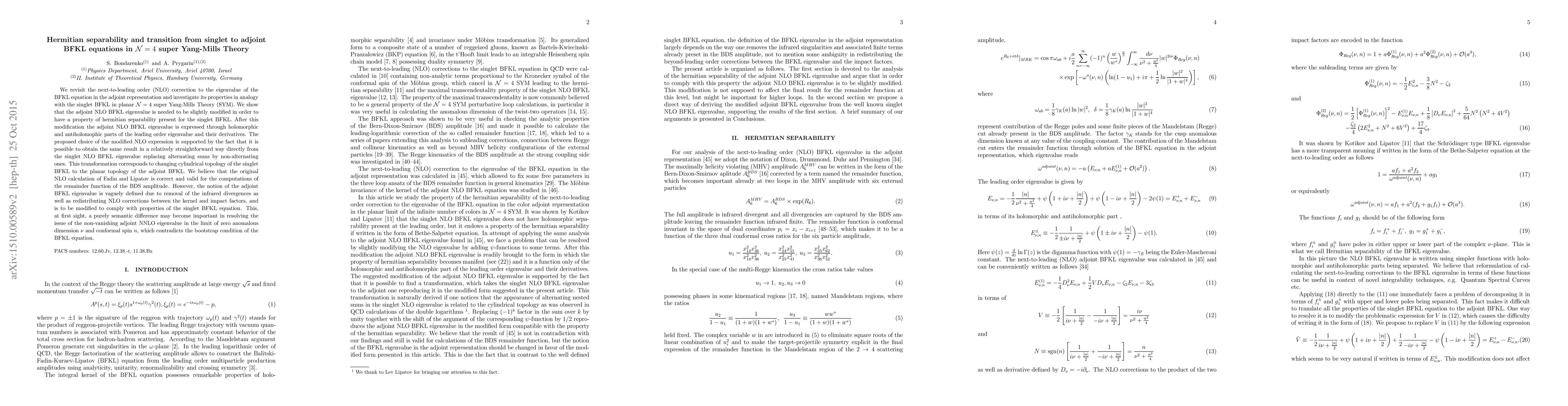 We revisit the next-to-leading order~(NLO) correction to the eigenvalue of the BFKL equation in the adjoint representation and investigate its properties in analogy with the singlet BFKL in planar $\mathcal{N}=4$ super Yang-Mills Theory~(SYM). We show that the adjoint NLO BFKL eigenvalue is needed to be slightly modified in order to have a property of hermitian separability present for the singlet BFKL. After this modification the adjoint NLO BFKL eigenvalue is expressed through holomorphic and antiholomophic parts of the leading order eigenvalue and their derivatives. The proposed choice of the modified NLO expression is supported by the fact that it is possible to obtain the same result in a relatively straightforward way directly from the singlet NLO BFKL eigenvalue replacing alternating sums by non-alternating ones. This transformation corresponds to changing cylindrical topology of the singlet BFKL to the planar topology of the adjoint BFKL. We believe that the original NLO calculation of Fadin and Lipatov is correct and valid for the computations of the remainder function of the BDS amplitude. However, the notion of the adjoint BFKL eigenvalue is vaguely defined due to removal of the infrared divergences as well as redistributing NLO corrections between the kernel and impact factors, and is to be modified to comply with properties of the singlet BFKL equation. This, at first sight, a purely semantic difference may become important in resolving the issue of the non-vanishing adjoint NNLO eigenvalue in the limit of zero anomalous dimension $\nu$ and conformal spin $n$, which contradicts the bootstrap condition of the BFKL equation.