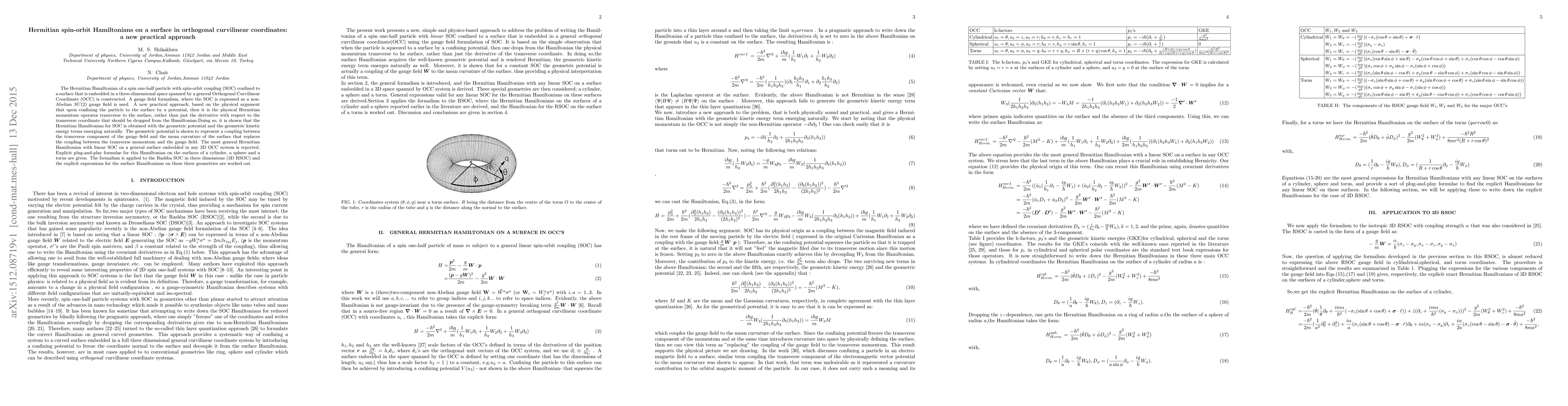 The Hermitian Hamiltonian of a spin one-half particle with spin-orbit coupling (SOC) confined to a surface that is embedded in a three-dimensional space spanned by a general Orthogonal Curvilinear Coordinate (OCC) is constructed. A gauge field formalism, where the SOC is expressed as a non-Abelian $SU(2)$ gauge field is used. A new practical approach, based on the physical argument that upon confining the particle to the surface by a potential, then it is the physical Hermitian momentum operator transverse to the surface, rather than just the derivative with respect to the transverse coordinate that should be dropped from the Hamiltonian.Doing so, it is shown that the Hermitian Hamiltonian for SOC is obtained with the geometric potential and the geometric kinetic energy terms emerging naturally. The geometric potential is shown to represent a coupling between the transverse component of the gauge field and the mean curvature of the surface that replaces the coupling between the transverse momentum and the gauge field. The most general Hermitian Hamiltonian with linear SOC on a general surface embedded in any 3D OCC system is reported. Explicit plug-and-play formulae for this Hamiltonian on the surfaces of a cylinder, a sphere and a torus are given. The formalism is applied to the Rashba SOC in three dimensions (3D RSOC) and the explicit expressions for the surface Hamiltonians on these three geometries are worked out.