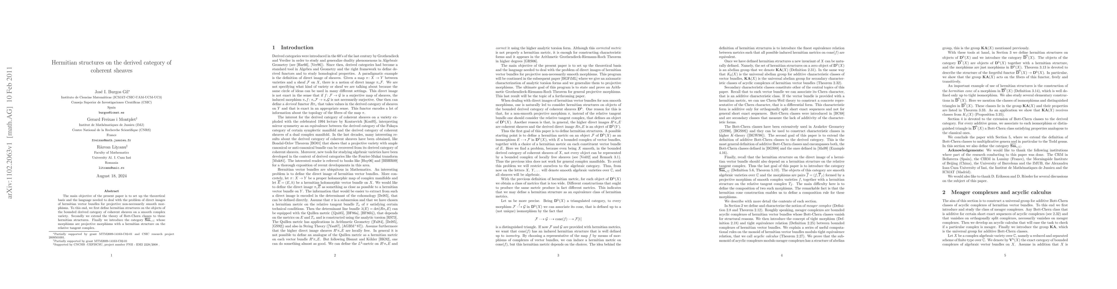 This paper establishes a framework for hermitian structures on the derived category of coherent sheaves on smooth complex varieties, extending Bott-Chern classes to these structures and introducing a category for projective morphisms with hermitian relative tangent complexes.