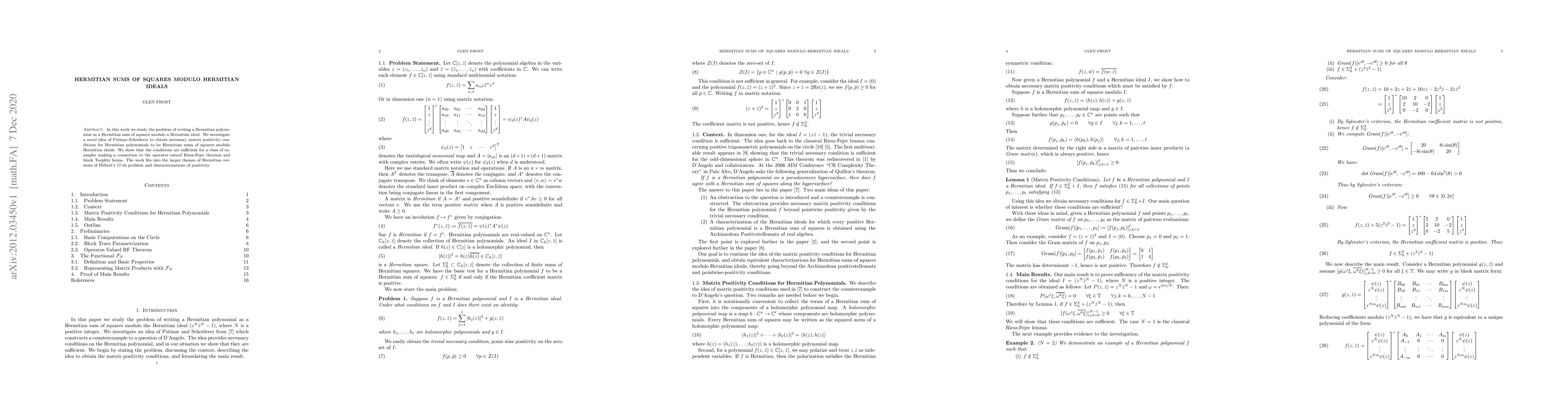 This paper explores the representation of Hermitian polynomials as sums of squares modulo Hermitian ideals, utilizing matrix positivity conditions inspired by Putinar-Scheiderer. It establishes sufficient conditions for specific cases, linking to the operator-valued Riesz-Fejer theorem and block Toeplitz forms.
