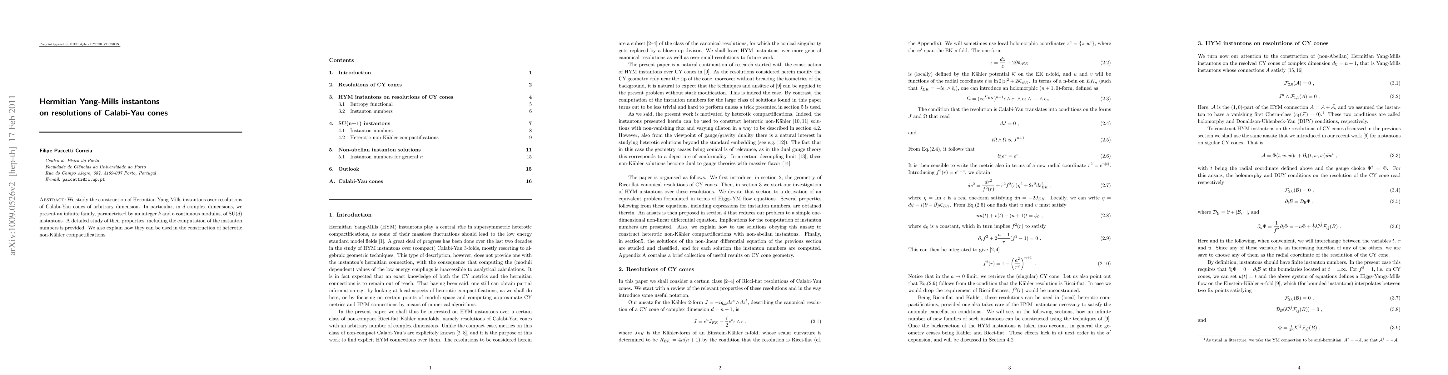 We study the construction of Hermitian Yang-Mills instantons over resolutions of Calabi-Yau cones of arbitrary dimension. In particular, in d complex dimensions, we present an infinite family, parametrised by an integer k and a continuous modulus, of SU(d) instantons. A detailed study of their properties, including the computation of the instanton numbers is provided. We also explain how they can be used in the construction of heterotic non-Kahler compactifications.