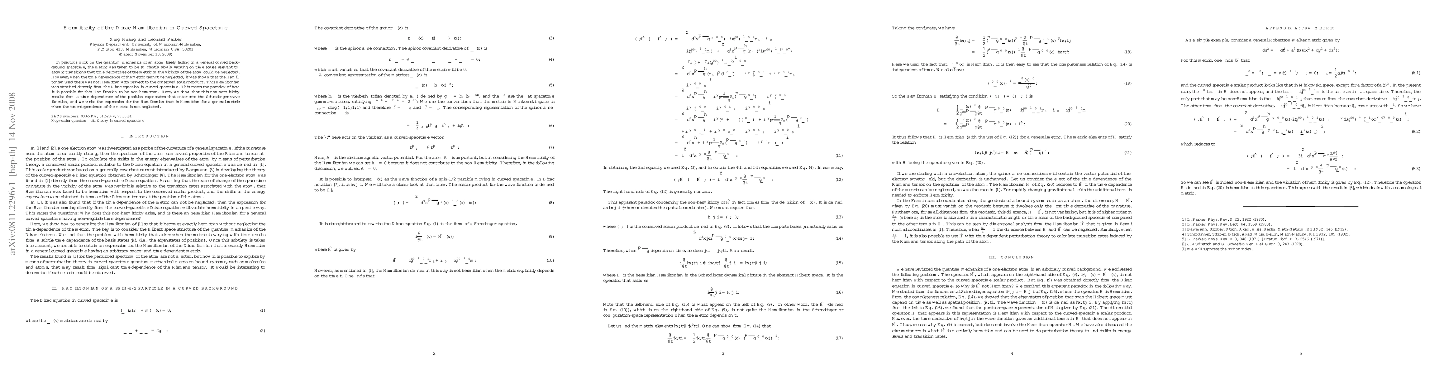 This paper addresses the Hermiticity of the Dirac Hamiltonian in curved spacetime, revealing that previous formulations were non-Hermitian due to neglected time-dependent metric derivatives. The authors propose a new Hermitian Hamiltonian expression that accounts for the time-dependence of the metric.