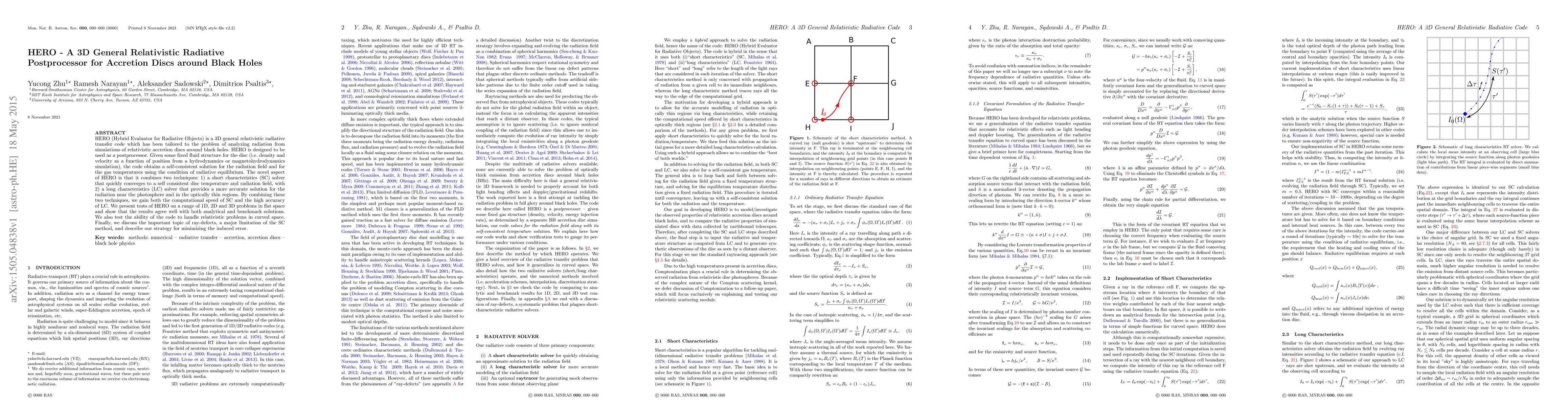 HERO is a 3D general relativistic radiative transfer postprocessor designed for analyzing radiation from accretion discs around black holes. It combines short and long characteristics solvers to achieve both computational speed and high accuracy in radiative equilibrium.