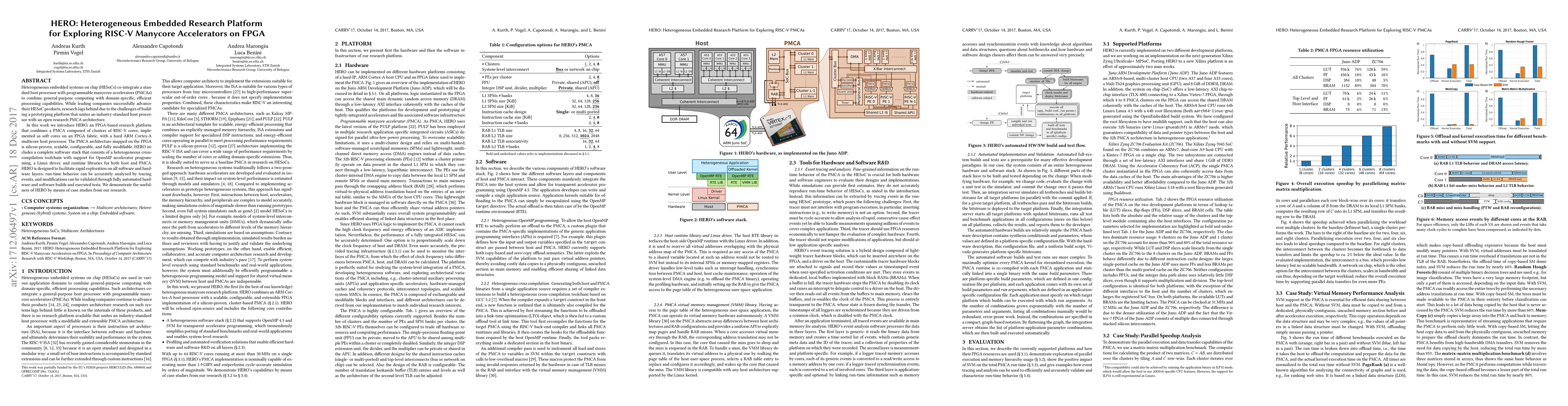 HERO is an FPGA-based research platform that integrates a scalable, programmable manycore RISC-V accelerator with a hard ARM Cortex-A host processor, designed to facilitate rapid prototyping and exploration of heterogeneous embedded systems. It includes a comprehensive software stack and automated tools for testing and validation, demonstrated through relevant case studies.