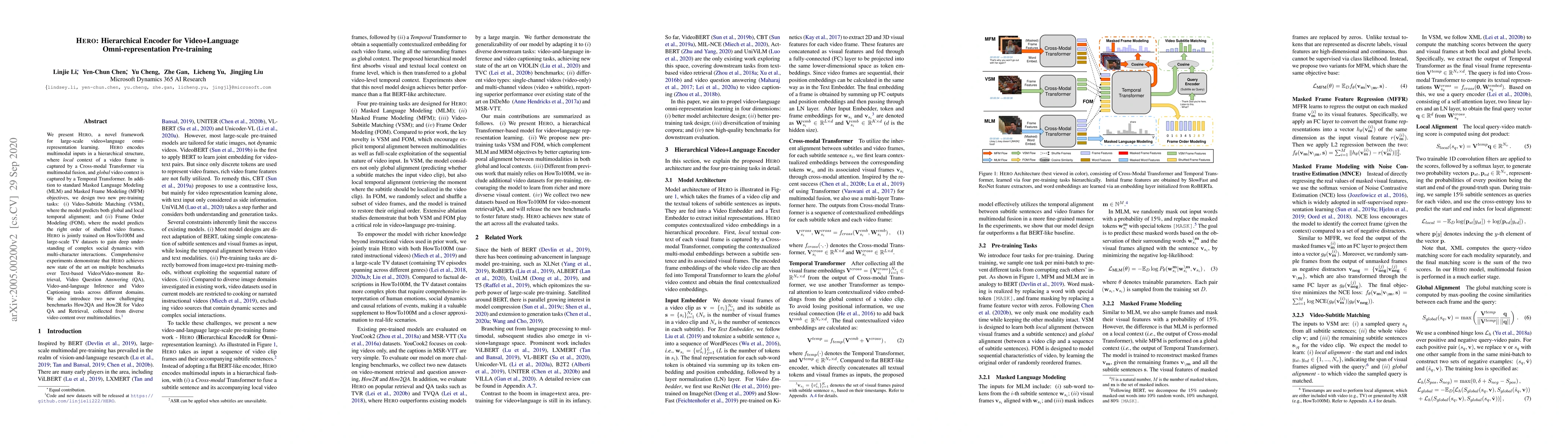 HERO is a framework for learning omni-representations from video and language through hierarchical encoding. It achieves state-of-the-art results on various benchmarks by incorporating new pre-training tasks and is trained on large-scale datasets.