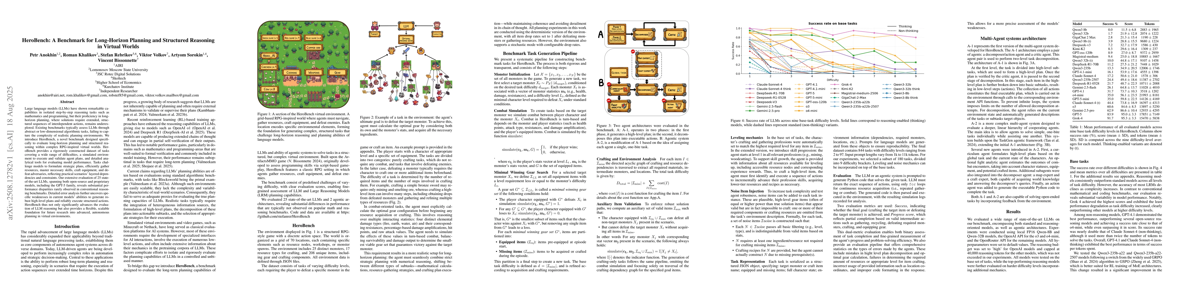 HeroBench introduces a benchmark for evaluating long-horizon planning and structured reasoning in complex RPG-inspired virtual worlds, using a simulated environment and detailed analytical tools to assess 25 state-of-the-art LLMs.