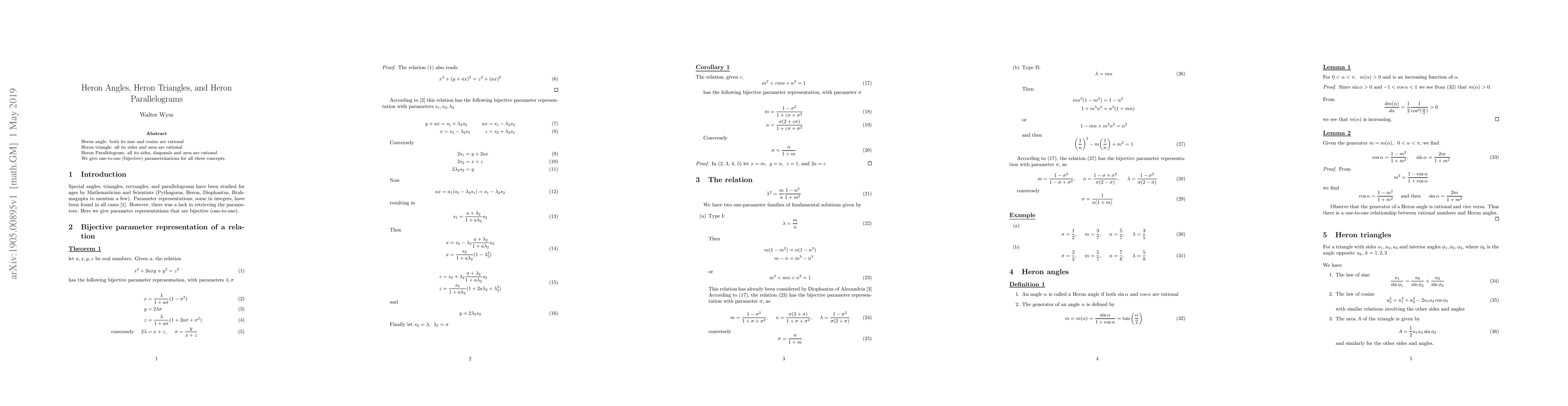 Heron angle: both its sine and cosine are rational Heron triangle: all its sides and area are rational Heron Parallelogram: all its sides, diagonals and area are rational We give one-to-one (bijective) parametrizations for all three concepts.