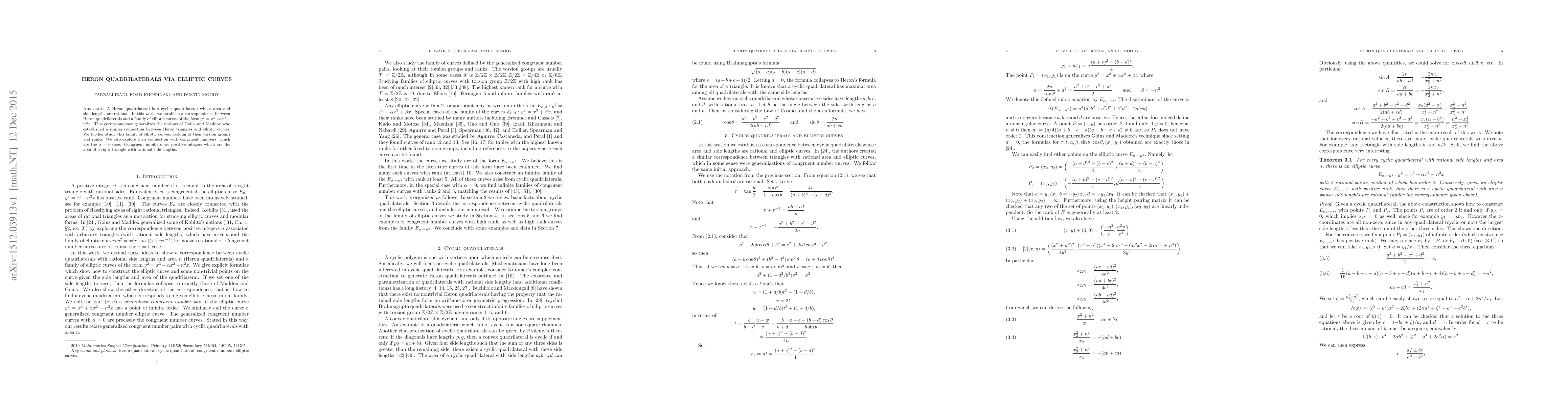 A Heron quadrilateral is a cyclic quadrilateral whose area and side lengths are rational. In this work, we establish a correspondence between Heron quadrilaterals and a family of elliptic curves of the form $y^2 = x3+/alpha x^2-n^2x.$ This correspondence generalizes the notions of Goins and Maddox who established a similar connection between Heron triangles and elliptic curves. We further study this family of elliptic curves, looking at their torsion groups and ranks. We also explore their connection with congruent numbers, which are the /alpha = 0 case. Congruent numbers are positive integers which are the area of a right triangle with rational side lengths. This is a new characterization of congruent numbers in terms of Heron Quadrilaterals.