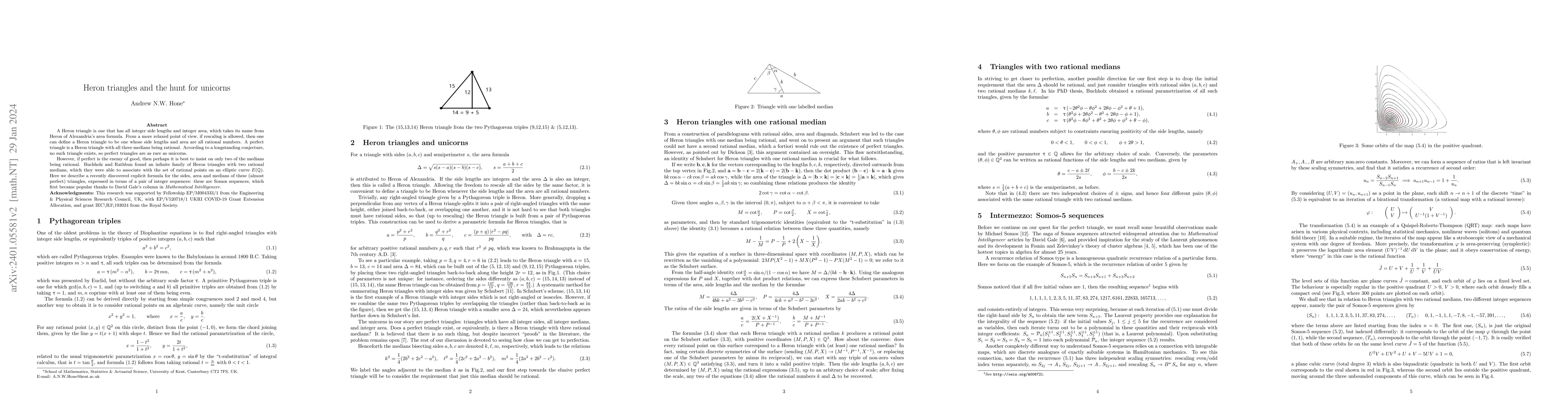 A Heron triangle is one that has all integer side lengths and integer area, which takes its name from Heron of Alexandria's area formula. From a more relaxed point of view, if rescaling is allowed, then one can define a Heron triangle to be one whose side lengths and area are all rational numbers. A perfect triangle is a Heron triangle with all three medians being rational. According to a longstanding conjecture, no such triangle exists, so perfect triangles are as rare as unicorns. However, if perfect is the enemy of good, then perhaps it is best to insist on only two of the medians being rational. Buchholz and Rathbun found an infinite family of Heron triangles with two rational medians, which they were able to associate with the set of rational points on an elliptic curve $E(\mathbb{Q})$. Here we describe a recently discovered explicit formula for the sides, area and medians of these (almost perfect) triangles, expressed in terms of a pair of integer sequences: these are Somos sequences, which first became popular thanks to David Gale's column in Mathematical Intelligencer.
