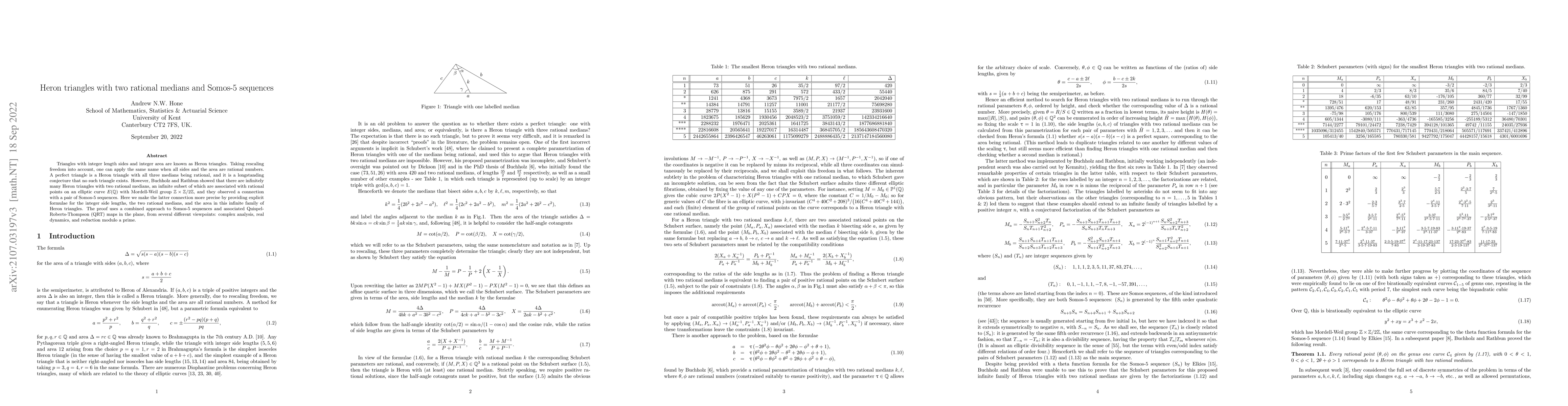 This paper explores Heron triangles with two rational medians and establishes a precise connection to Somos-5 sequences, providing explicit formulae for their integer side lengths, rational medians, and area. The proof integrates complex analysis, real dynamics, and modular reduction techniques.