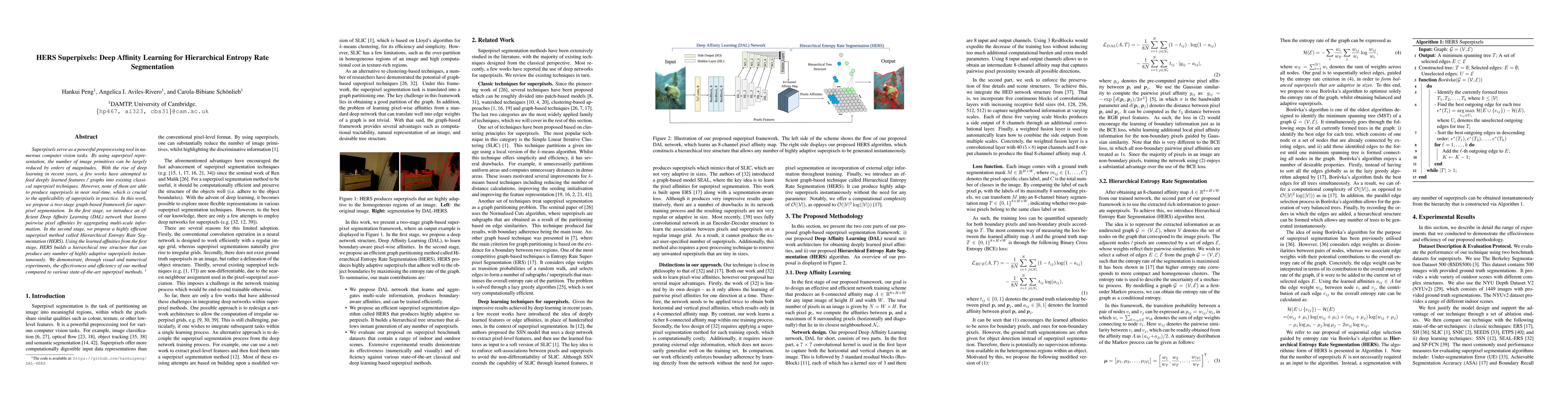 This paper proposes a two-stage graph-based framework for superpixel segmentation, utilizing a Deep Affinity Learning network for efficient pairwise pixel affinity computation and a Hierarchical Entropy Rate Segmentation method for adaptive superpixel generation. The approach achieves near real-time performance and outperforms existing state-of-the-art methods.