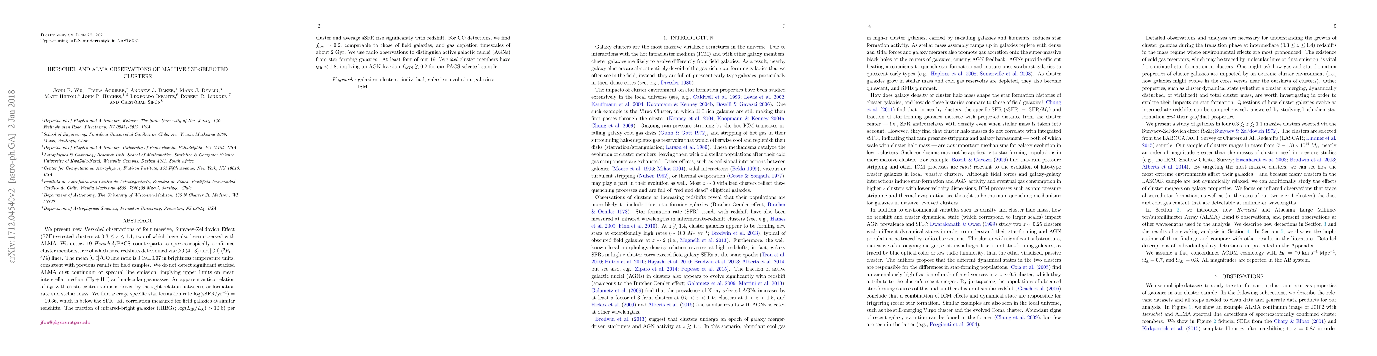 We present new Herschel observations of four massive, Sunyaev-Zel'dovich Effect (SZE)-selected clusters at $0.3 \leq z \leq 1.1$, two of which have also been observed with ALMA. We detect 19 Herschel/PACS counterparts to spectroscopically confirmed cluster members, five of which have redshifts determined via CO($4-3$) and [CI](${}^3P_1 - {}^3P_0$) lines. The mean [CI]/CO line ratio is $0.19 \pm 0.07$ in brightness temperature units, consistent with previous results for field samples. We do not detect significant stacked ALMA dust continuum or spectral line emission, implying upper limits on mean interstellar medium (H$_2$ + HI) and molecular gas masses. An apparent anticorrelation of $L_{IR}$ with clustercentric radius is driven by the tight relation between star formation rate and stellar mass. We find average specific star formation rate log(sSFR/yr$^{-1}$) = -10.36, which is below the SFR$-M_*$ correlation measured for field galaxies at similar redshifts. The fraction of infrared-bright galaxies (IRBGs; $\log (L_{IR}/L_\odot) > 10.6$) per cluster and average sSFR rise significantly with redshift. For CO detections, we find $f_{gas} \sim 0.2$, comparable to those of field galaxies, and gas depletion timescales of about 2 Gyr. We use radio observations to distinguish active galactic nuclei (AGNs) from star-forming galaxies. At least four of our 19 Herschel cluster members have $q_{IR} < 1.8$, implying an AGN fraction $f_{AGN} \gtrsim 0.2$ for our PACS-selected sample.