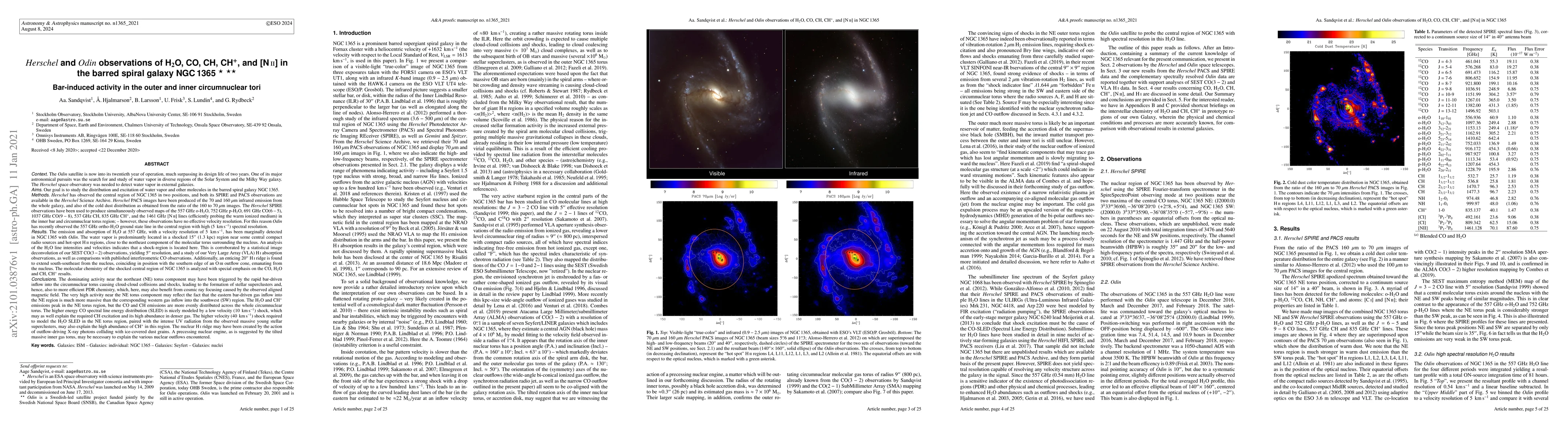 The Odin satellite is now into its twentieth year of operation, much surpassing its design life of two years. One of its major pursuits was the search for and study of H2O in the Solar System and the Milky Way galaxy. Herschel has observed the central region of NGC 1365 in two positions, and both its SPIRE and PACS observations are available in the Herschel Science Archive. Herschel PACS images have been produced of the 70 and 160 micron infrared emission from the whole galaxy, and also of the cold dust distribution as obtained from the ratio of the 160 to 70 micron images. The Herschel SPIRE observations have been used to produce maps of the 557 GHz o-H2O, 752 GHz p-H2O, 691 GHz CO(6-5), 1037 GHz CO(9-8), 537 GHz CH, 835 GHz CH+, and the 1461 GHz NII lines; however, these observations have no effective velocity resolution. Odin has recently observed the 557 GHz o-H2O ground state line in the central region with high (5 km/s) spectral resolution. The emission and absorption of H2O at 557 GHz, with a velocity resolution of 5 km/s, has been marginally detected in NGC 1365 with Odin. The H2O is predominantly located in a shocked 15" (1.3 kpc) region near some central compact radio sources and hot-spot HII regions, close to the northeast component of the molecular torus surrounding the nucleus. An analysis of the H2O line intensities and velocities indicates that a shock-region is located here. This is corroborated by a statistical image deconvolution of our SEST CO(3-2) observations, yielding 5" resolution, and a study of our VLA HI absorption observations. Additionally, an enticing 20" HI ridge is found to extend south-southeast from the nucleus, coinciding in position with the southern edge of an OIII outflow cone, emanating from the nucleus. The molecular chemistry of the shocked central region is analyzed with special emphasis on the CO, H2O and CH, CH+ results.