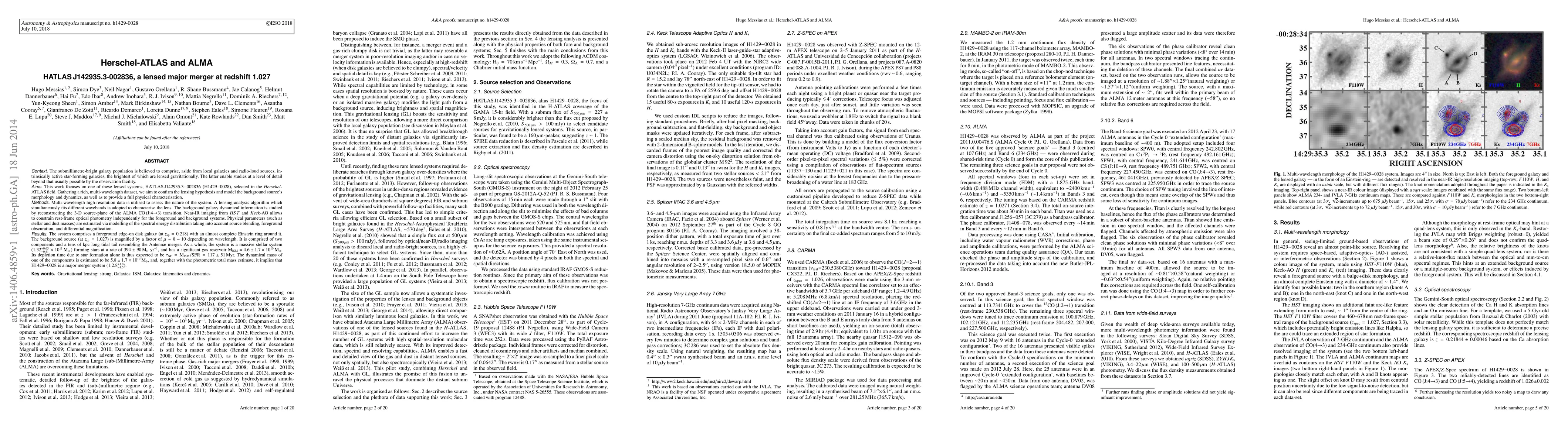 [Abridged] Aims: This work focuses on one lensed system, HATLAS J142935.3-002836 (H1429-0028), selected in the Herschel-ATLAS field. Gathering a rich, multi-wavelength dataset, we aim to confirm the lensing hypothesis and model the background source's morphology and dynamics, as well as to provide a full physical characterisation. Methods: Multi-wavelength high-resolution data is utilised to assess the nature of the system. A lensing-analysis algorithm which simultaneously fits different wavebands is adopted to characterise the lens. The background galaxy dynamical information is studied by reconstructing the 3-D source-plane of the ALMA CO(J:4-3) transition. Near-IR imaging from HST and Keck-AO allows to constrain rest-frame optical photometry independently for the foreground and background systems. Physical parameters (such as stellar and dust masses) are estimated via modelling of the spectral energy distribution taking into account source blending, foreground obscuration, and differential magnification. Results: The system comprises a foreground edge-on disk galaxy (at z_sp=0.218) with an almost complete Einstein ring around it. The background source (at z_sp=1.027) is magnified by a factor of ~8-10 depending on wavelength. It is comprised of two components and a tens of kpc long tidal tail resembling the Antennae merger. As a whole, the system is a massive stellar system (1.32[-0.41,+0.63] x1E11 Mo) forming stars at a rate of 394+-90 Mo/yr, and has a significant gas reservoir M_ISM = 4.6+-1.7 x1E10 Mo. Its depletion time due to star formation alone is thus expected to be tau_SF=M_ISM/SFR=117+-51 Myr. The dynamical mass of one of the components is estimated to be 5.8+-1.7 x1E10 Mo, and, together with the photometric total mass estimate, it implies that H1429-0028 is a major merger system (1:2.8[-1.5,+1.8]).