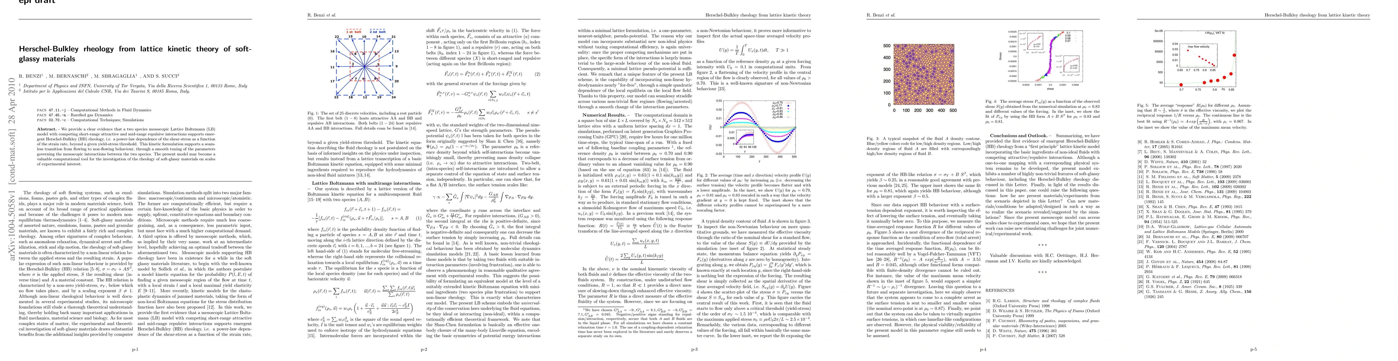 The paper demonstrates that a two-species mesoscopic Lattice Boltzmann model can reproduce Herschel-Bulkley rheology, showing a power-law shear-stress response beyond a yield-stress threshold, thereby providing a valuable computational tool for studying soft-glassy materials.