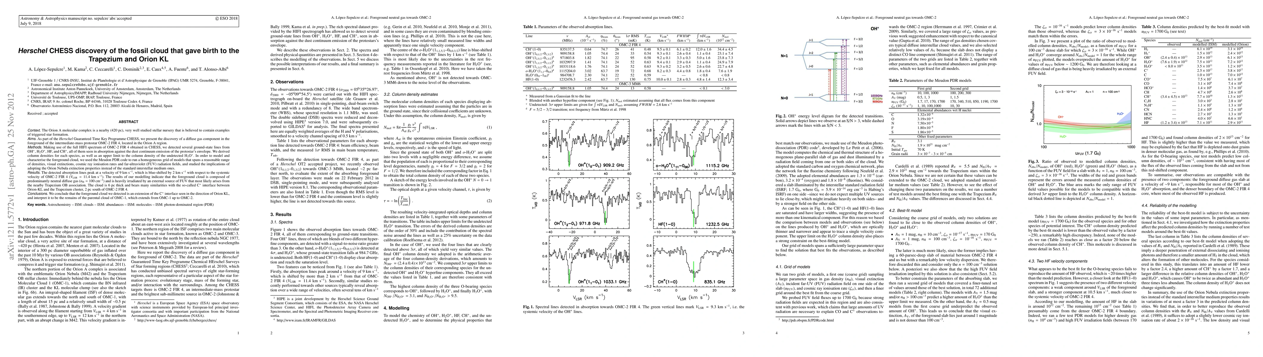 As part of the Herschel Guaranteed Time Key Programme CHESS, we present the discovery of a diffuse gas component in the foreground of the intermediate-mass protostar OMC-2 FIR 4, located in the Orion A region. Making use of the full HIFI spectrum of OMC-2 FIR 4 obtained in CHESS, we detected several ground-state lines from OH+, H2O+, HF, and CH+, all of them seen in absorption against the dust continuum emission of the protostar's envelope. The lines peak at a velocity of 9 km/s, which is blue-shifted by 2 km/s with respect to the systemic velocity of OMC-2 FIR 4 (V = 11.4 km/s). We derived column densities for each species, as well as an upper limit to the column density of the undetected H3O+. In order to model and characterise the foreground cloud, we used the Meudon PDR code to run a homogeneous grid of models that spans a reasonable range of densities, visual extinctions, cosmic ray ionisation rates and far-ultraviolet (FUV) radiation fields. The results of our modelling indicate that the foreground cloud is composed of predominantly neutral diffuse gas (n(H) = 100 cm-3) and is heavily irradiated by an external source of FUV that most likely arises from the nearby Trapezium OB association. The cloud is 6 pc thick and bears many similarities with the so-called C+ interface between Orion-KL and the Trapezium cluster, 2 pc south of OMC-2 FIR 4. We conclude that the foreground cloud we detected is an extension of the C+ interface seen in the direction of Orion KL, and interpret it to be the remains of the parental cloud of OMC-1, which extends from OMC-1 up to OMC-2.