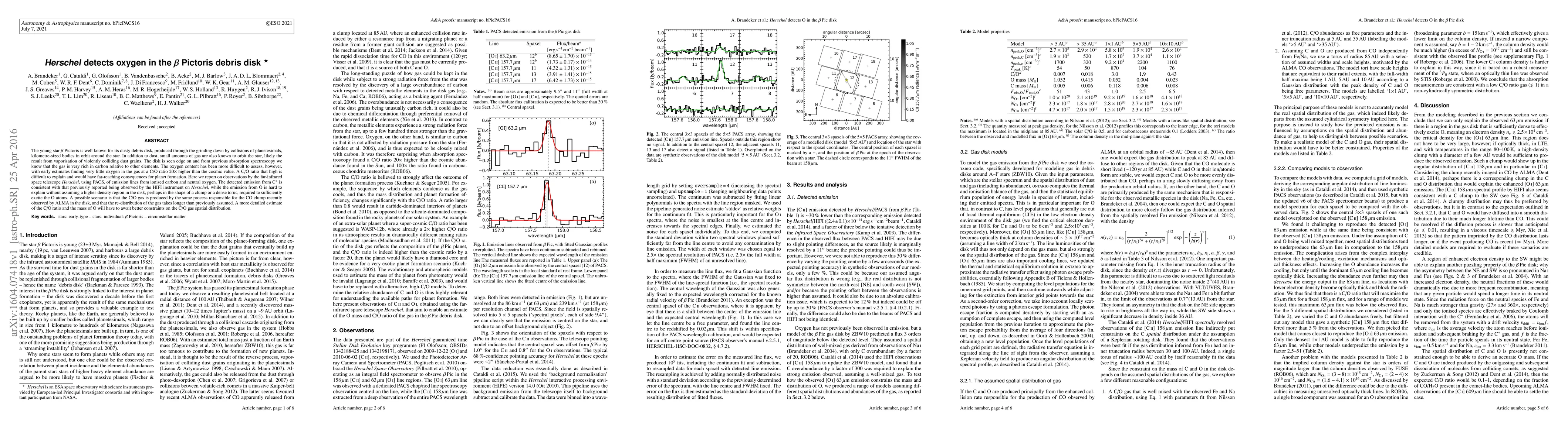 The paper presents the first detection of oxygen emission from the beta Pictoris debris disk using Herschel/PACS, providing new constraints on the gas composition and excitation mechanisms.