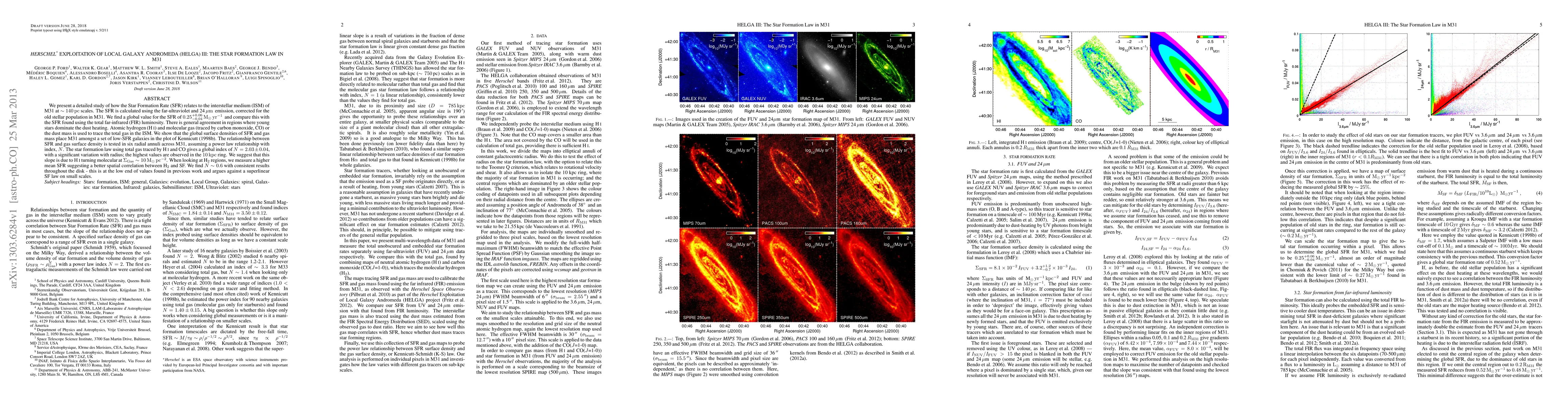 The HELGA III study investigates the star formation rate (SFR) in M31, finding a global SFR of 0.25±0.05Msun/yr. The study reveals a power law relationship between SFR and gas surface density, with a global index of N=2.03±0.04, suggesting HI converts to molecular gas at ~10Msun/pc2.