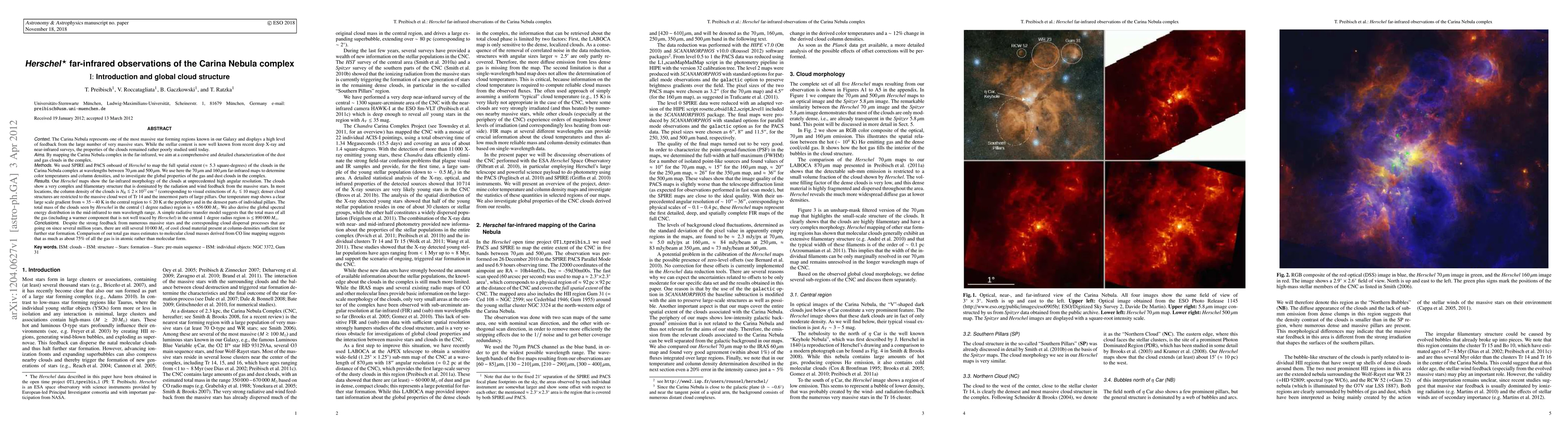 The Herschel far-infrared observations of the Carina Nebula reveal a complex, filamentary cloud structure shaped by massive star feedback, with a temperature gradient from 35-40 K in the center to <20 K at the periphery. Despite significant star formation feedback, substantial cool cloud material remains, indicating potential for future star formation.